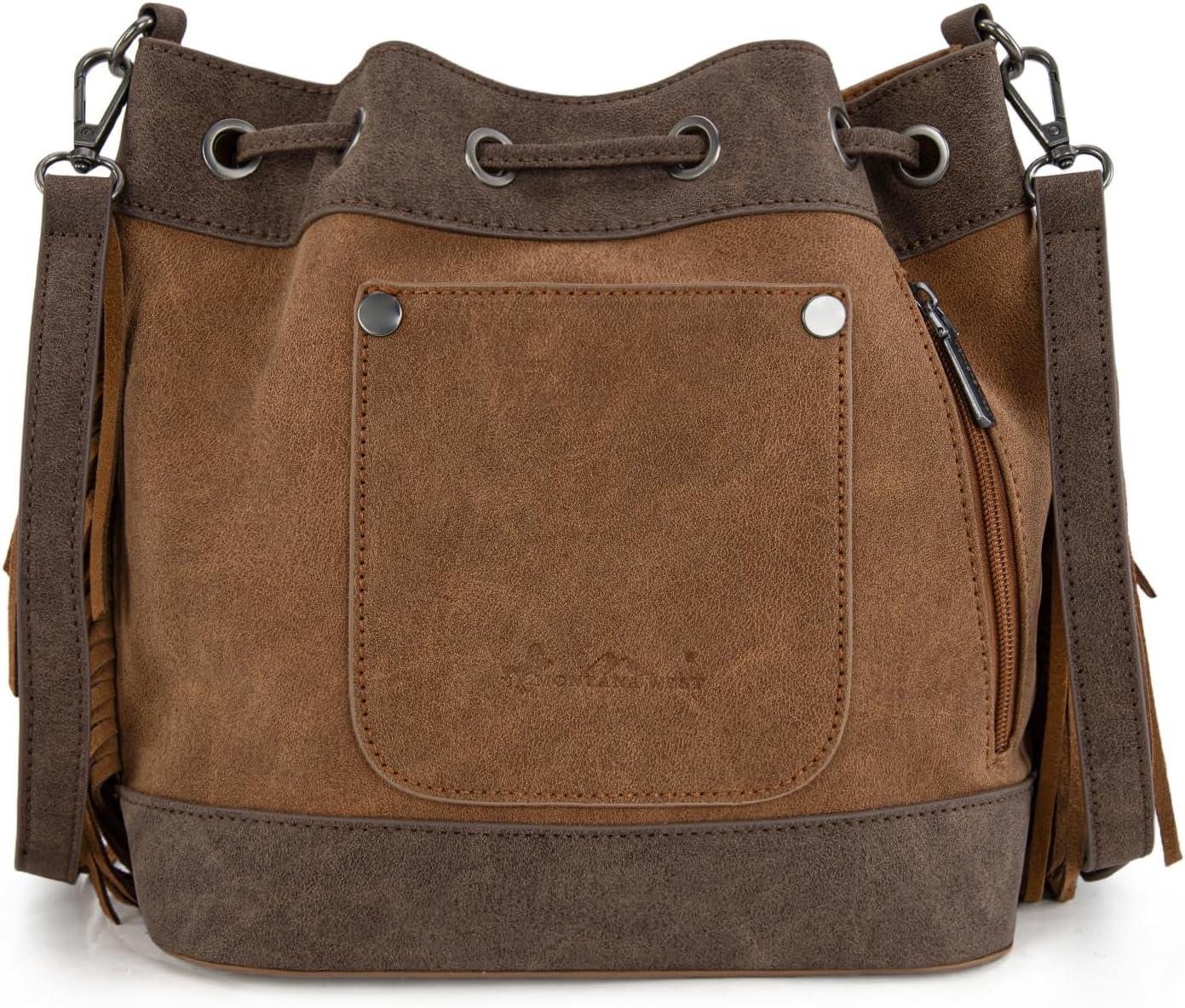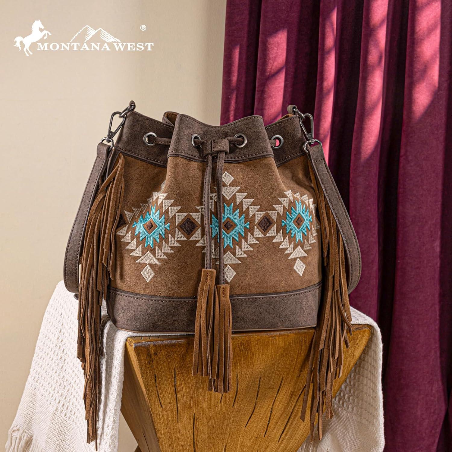 Montana West Aztec Bucket Bags for Women Western Fringe Crossbody Bag Ladies Vintage Drawstring Bucket Bag(Brown)