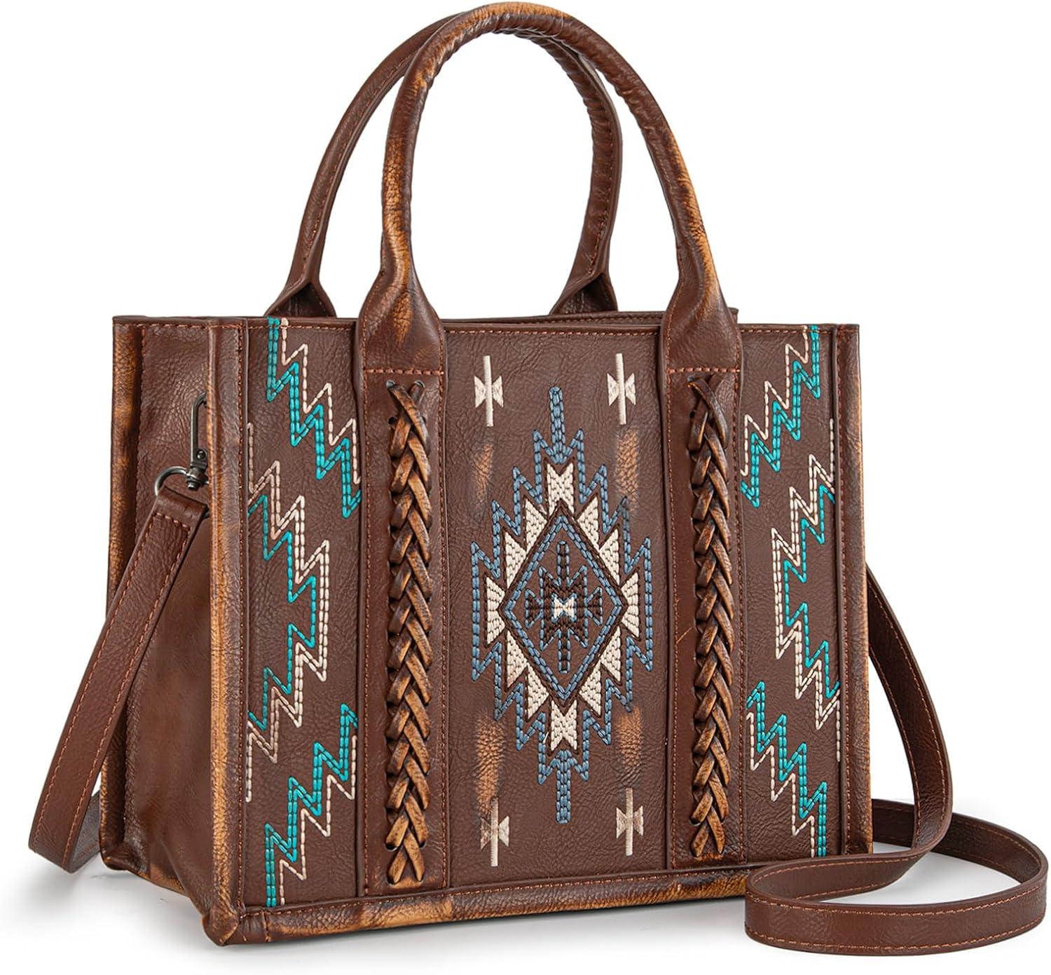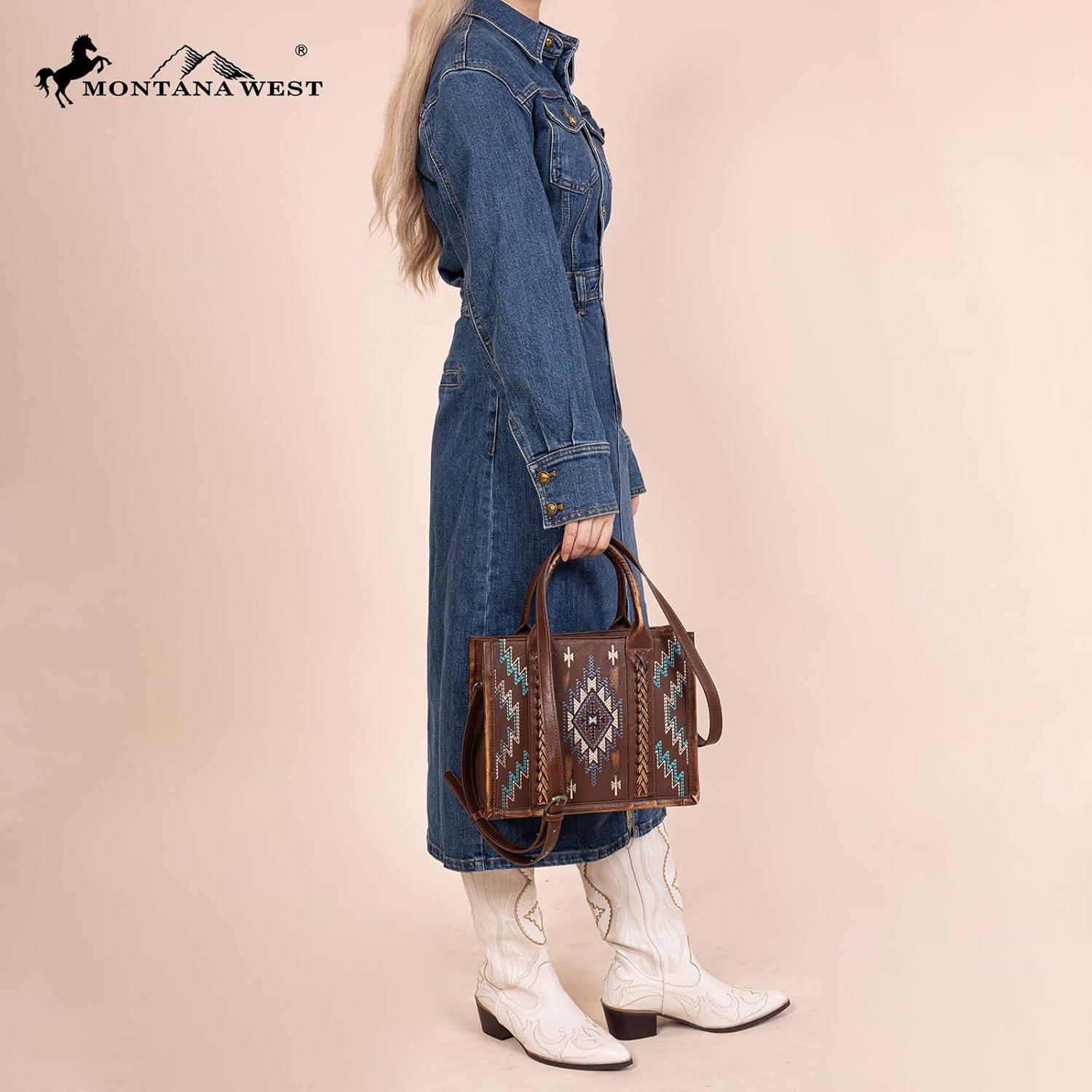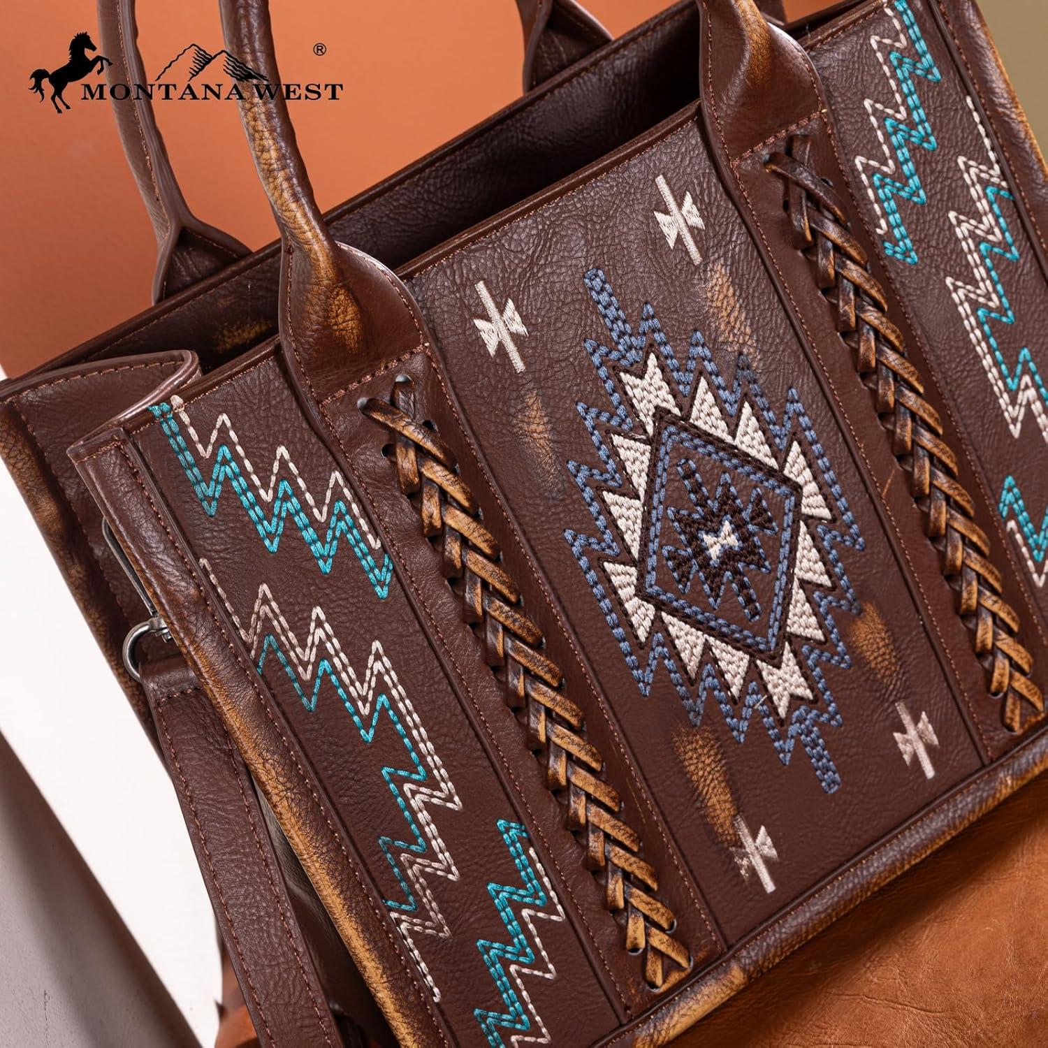 Montana West Aztec Embroidered Distressd Tote Bag With Wallet Set(Coffee)