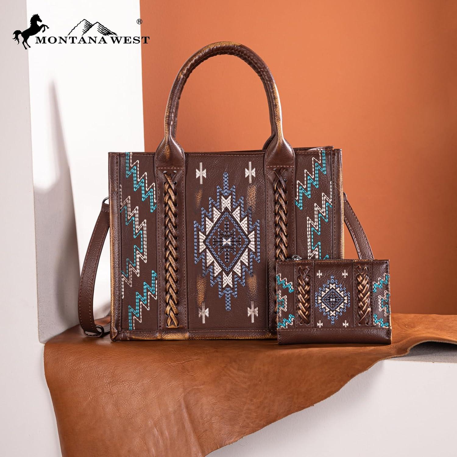 Montana West Aztec Embroidered Distressd Tote Bag With Wallet Set(Brown)