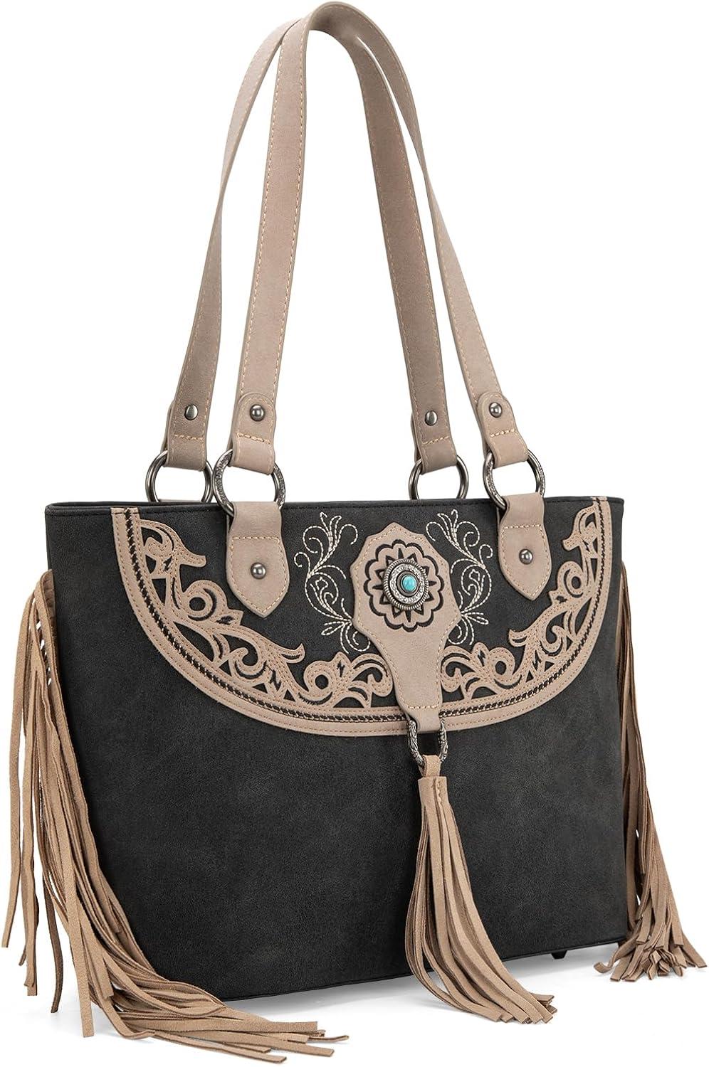 Montana West Aztec Tote Bag for Women Embroidered Western Shoulder Purse and Wallet Set(Fringe Black)