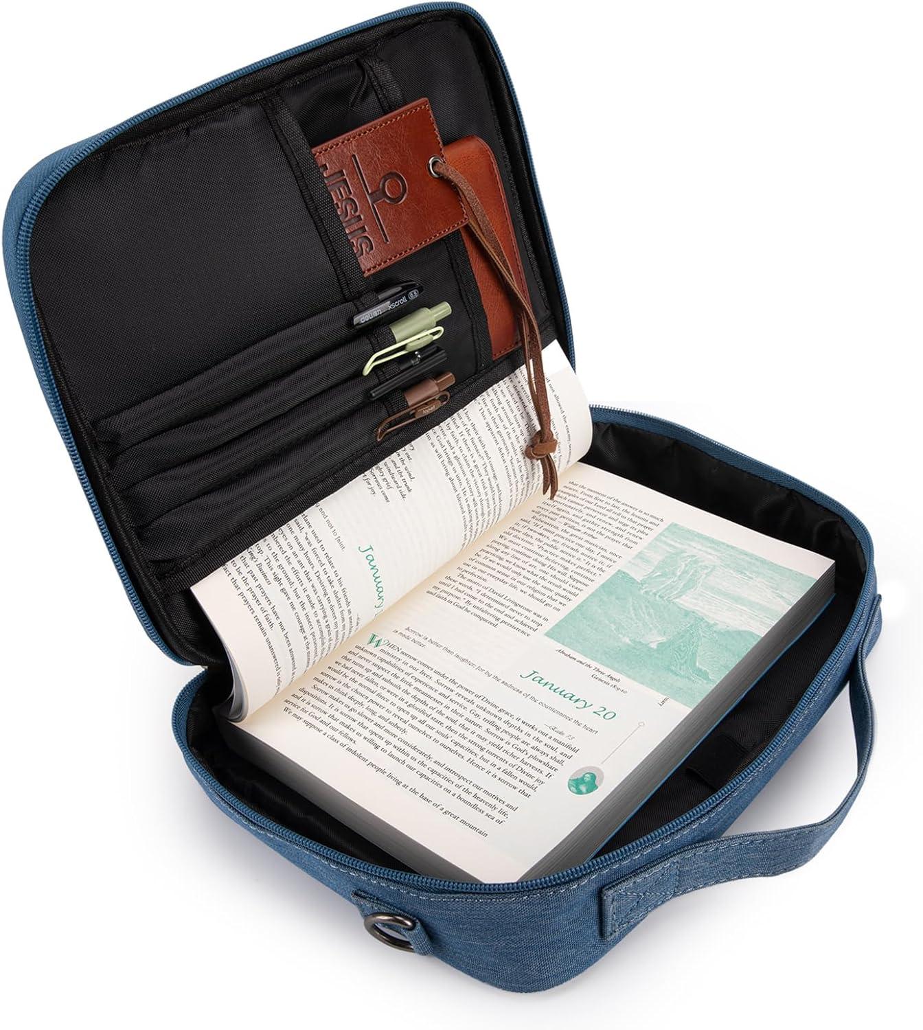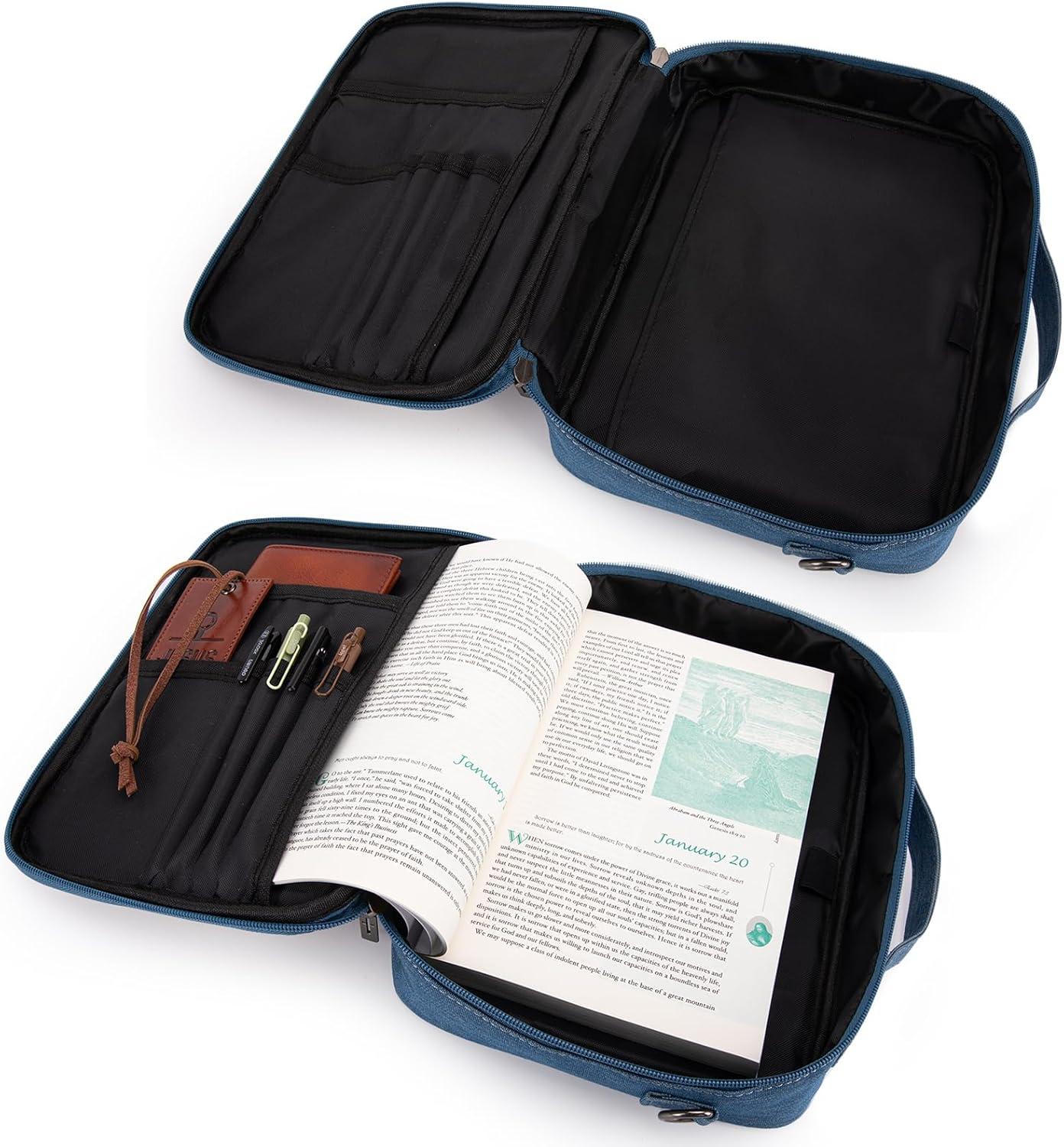 Size: Specifically designed at 10.2″ x 8.2″ x 2.6″, this book cover fits most standard bibles and provides storage for additional items on the go
