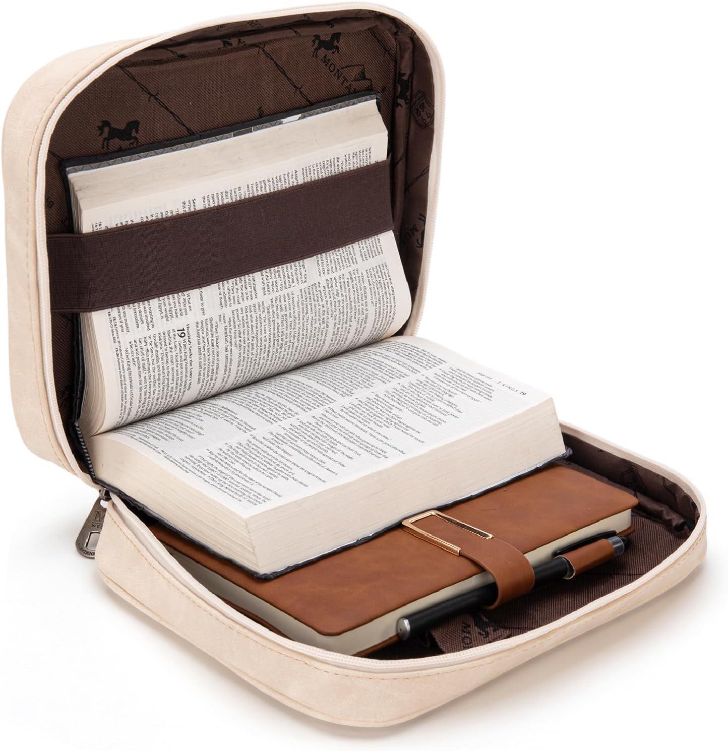 FEATURES: The bible cover is designed with 2 elastic straps to hold the bible in place and for easy reading, as well as a back zipper pocket to store small things.The Bible carrying case has a loop inside for a pen or highlighter accommodate different Bible dimensions, ensuring a snug and proper fit