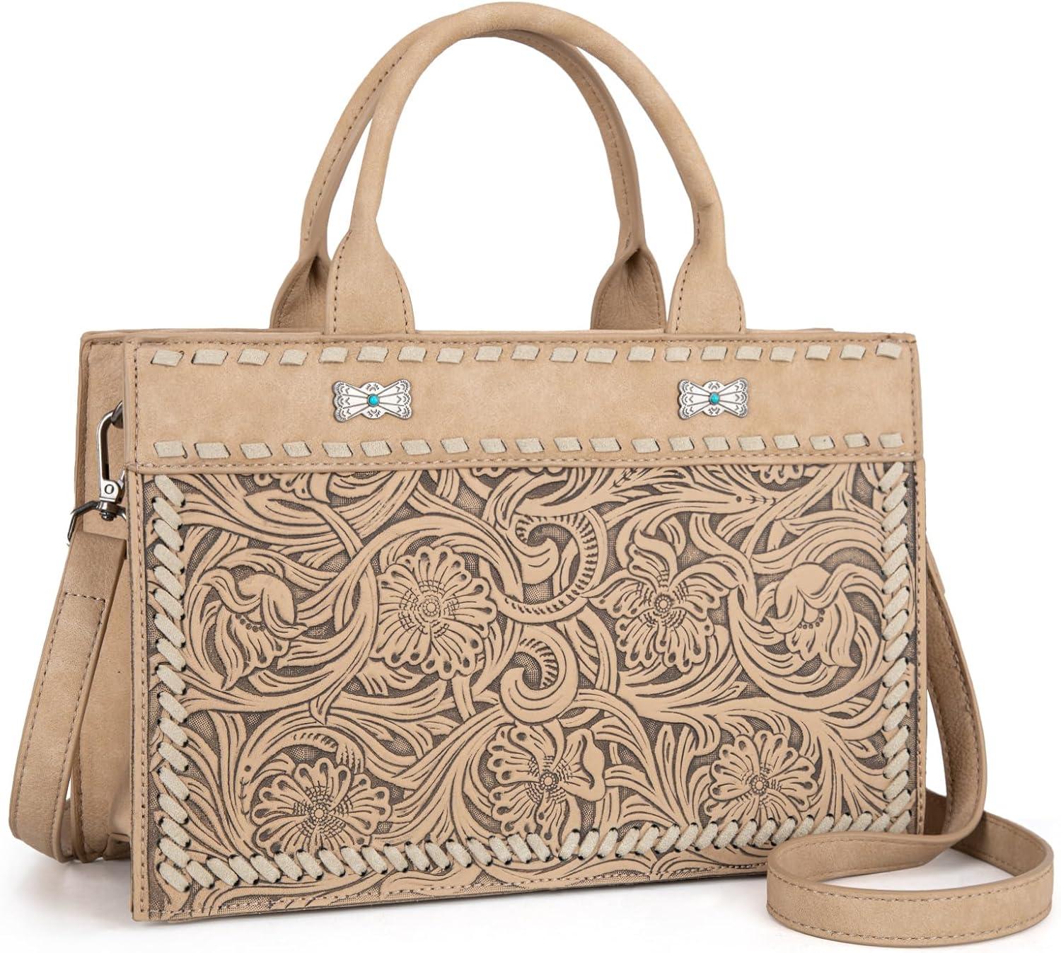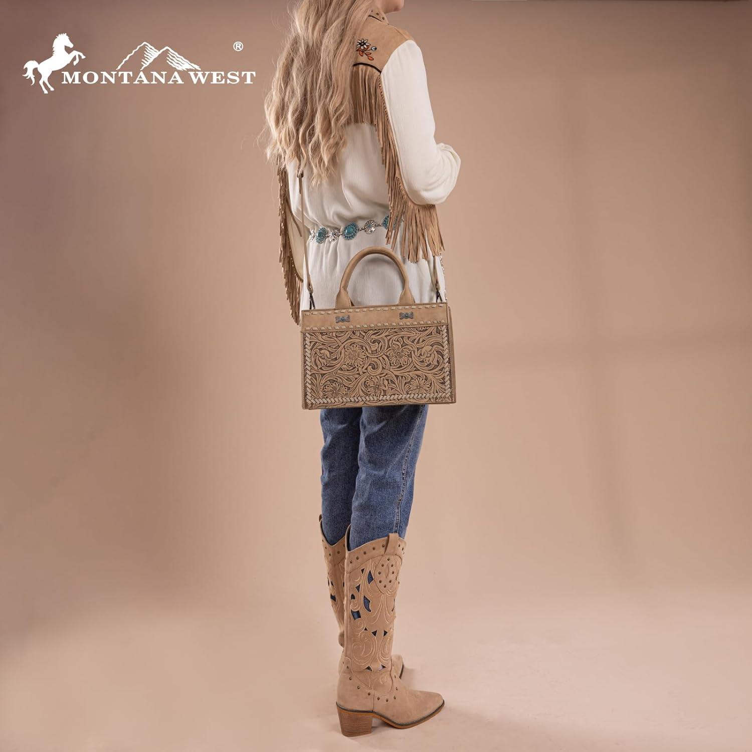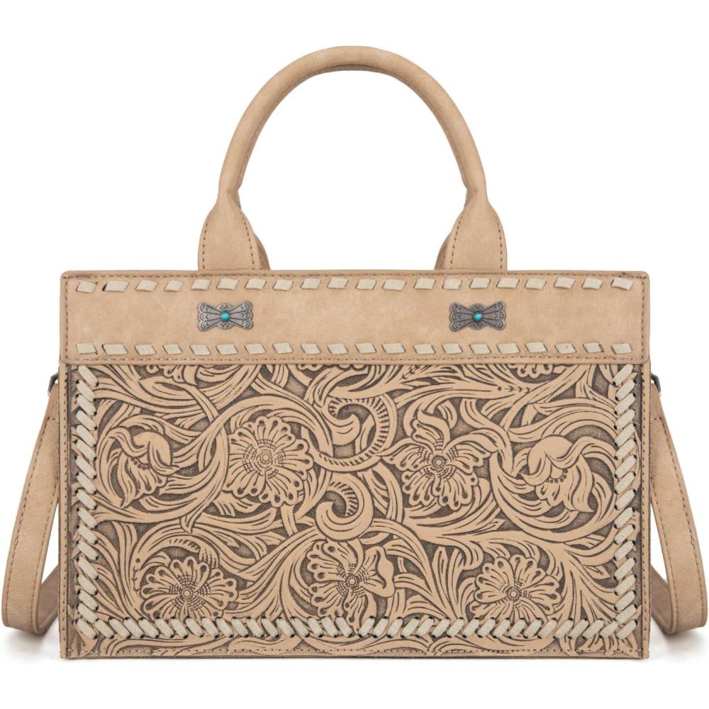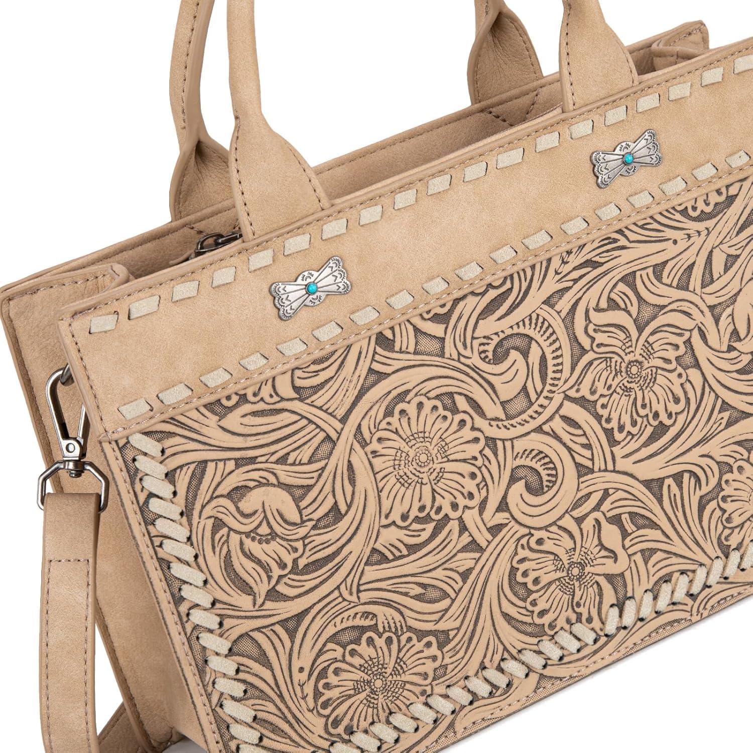 imageMontana West Western Tooling Handbags Vintage Prints and Whipstitch CraftsmanshipStitching Tan
