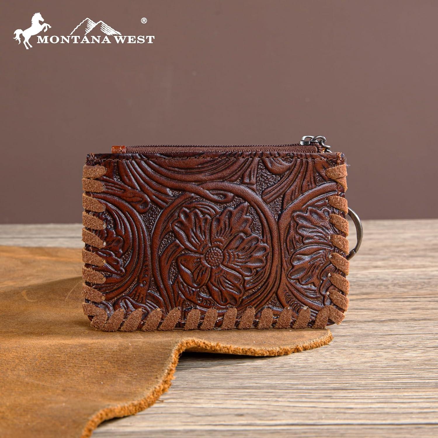 Montana West × Wrangler Coin Purse for Men Women Embossed Leather Coin Pouch Small Wallet, Black(Tooling Pouch Brown)