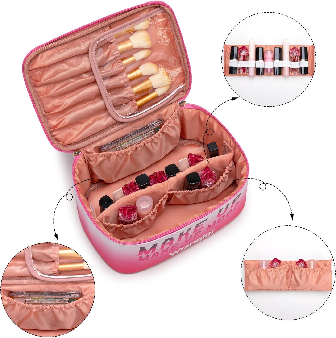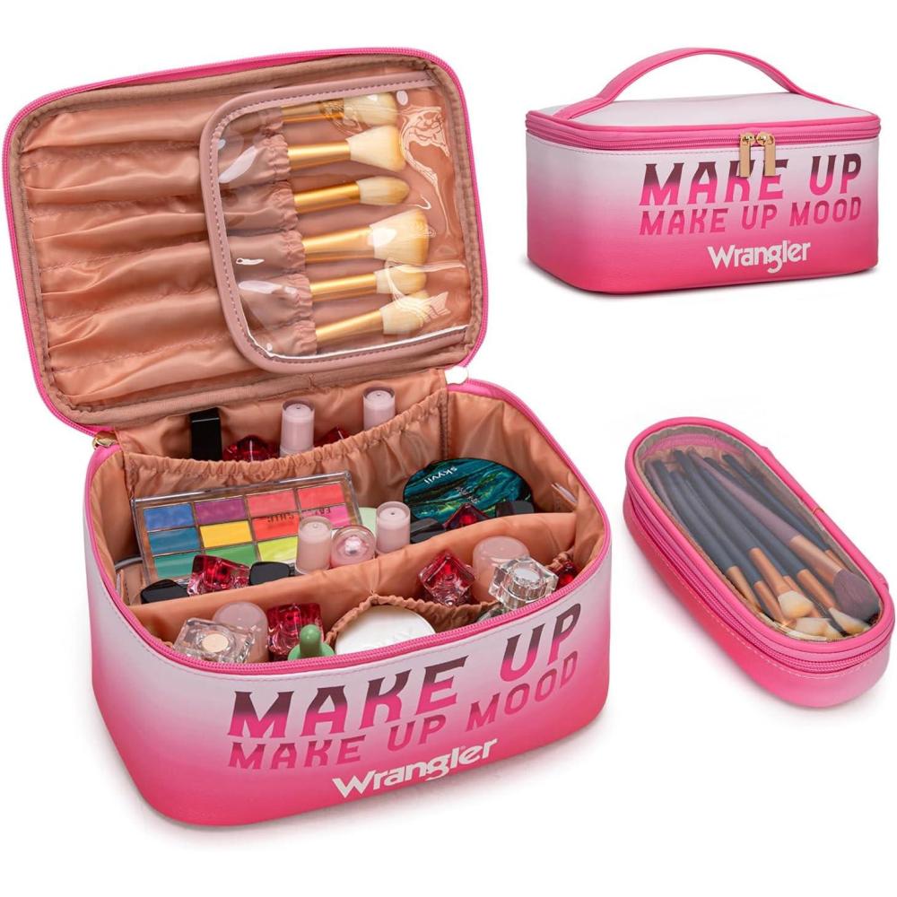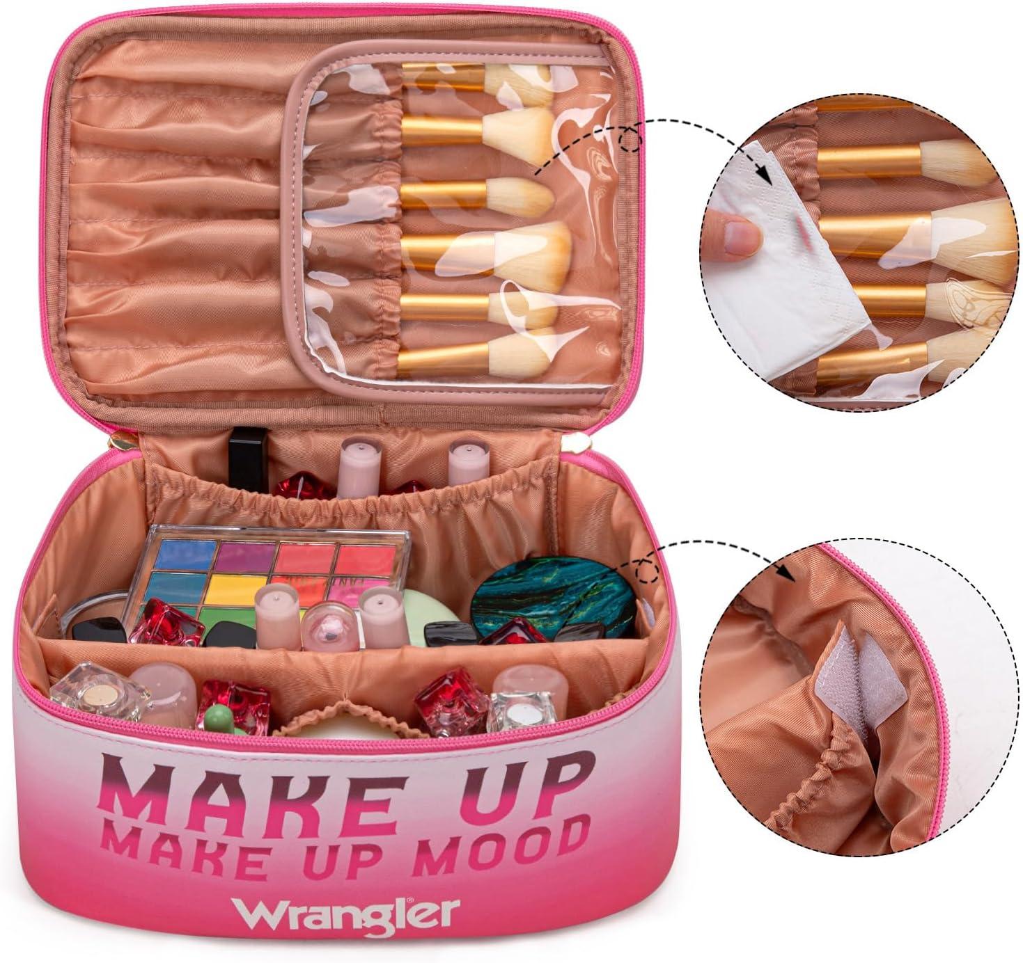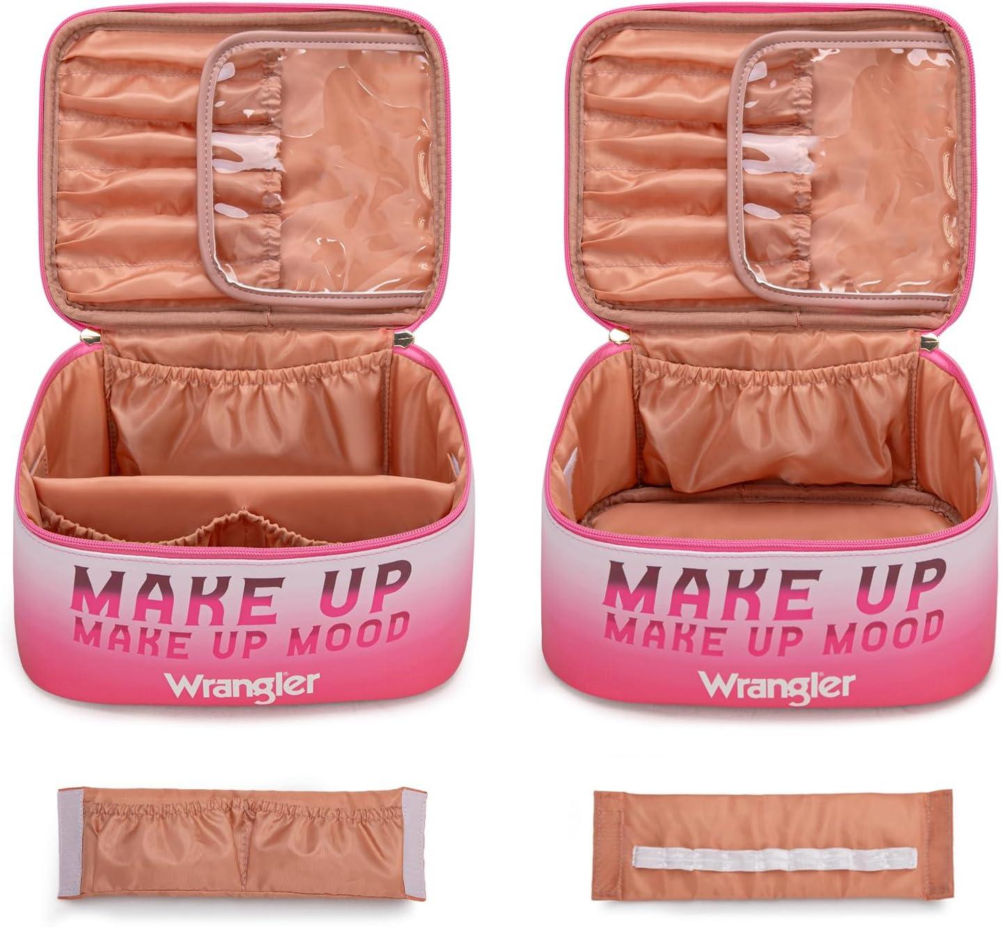 Montana West X Wrangler Travel Makeup Bag 2pcs Set Large Cosmetic Bag with Makeup Brush Holder Portable Make Up Organizer Cute Toiletry Bag with Divider and Handle for Women Gradient(Beige-Pink)