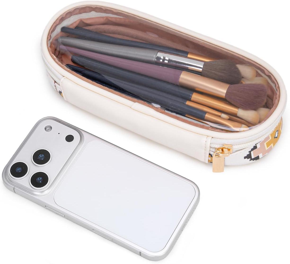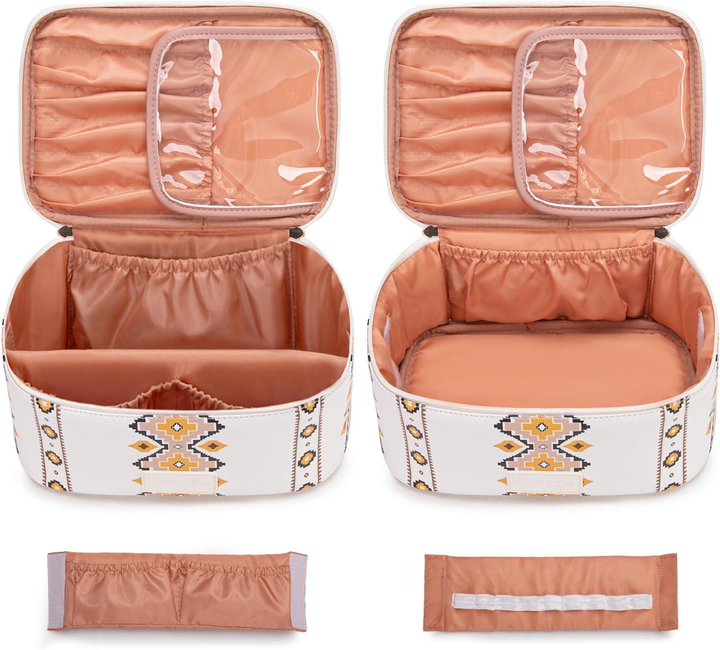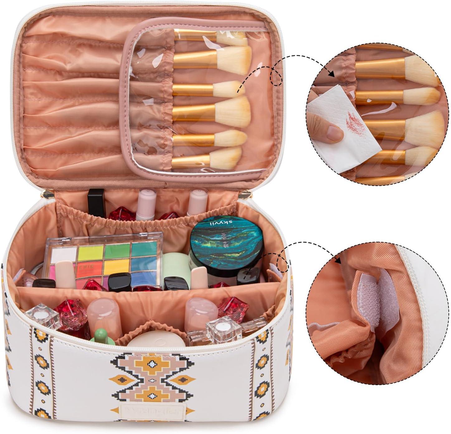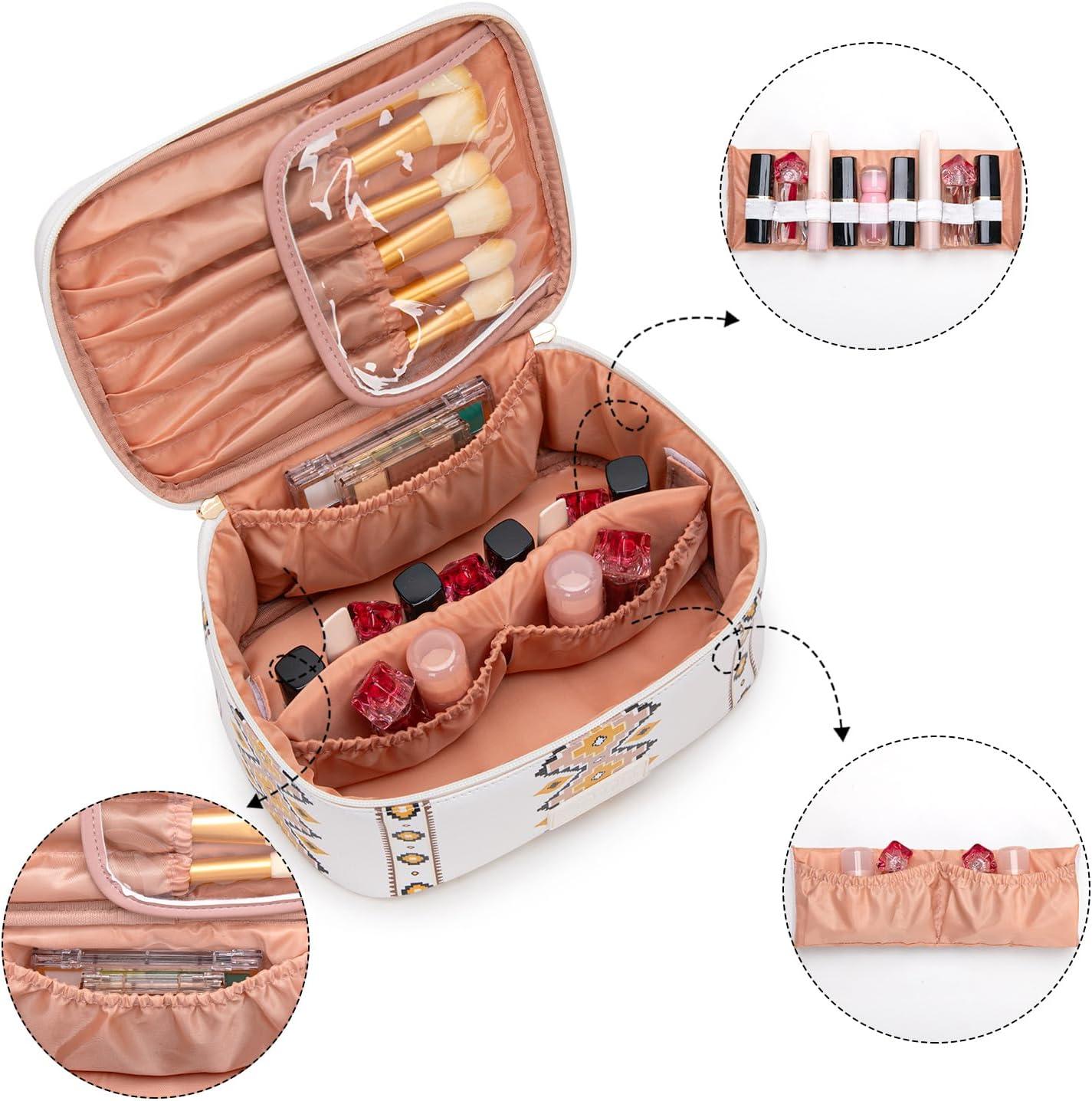 SPACIOUS & SMARTLY ORGANIZED: Never dig through a messy bag again! Cosmetic bag measures:10.3″x7.3″x4.7″, the large main compartment, coupled with multiple interior divider pockets and elastic loops, keeps your makeup, brushes, toiletries, and jewelry neatly separated and instantly accessible. Brush Holder:8.5″x3.5″x2″