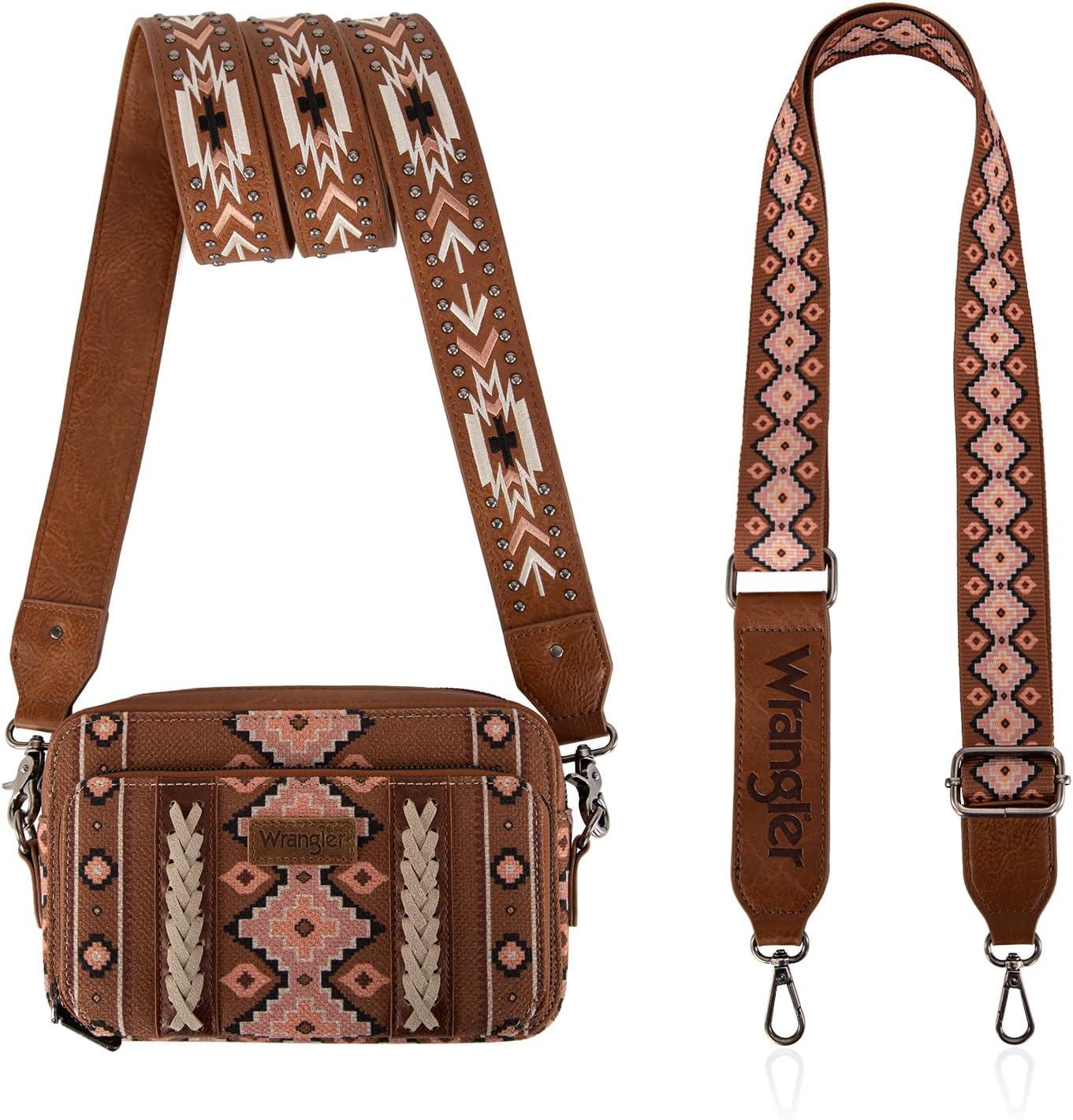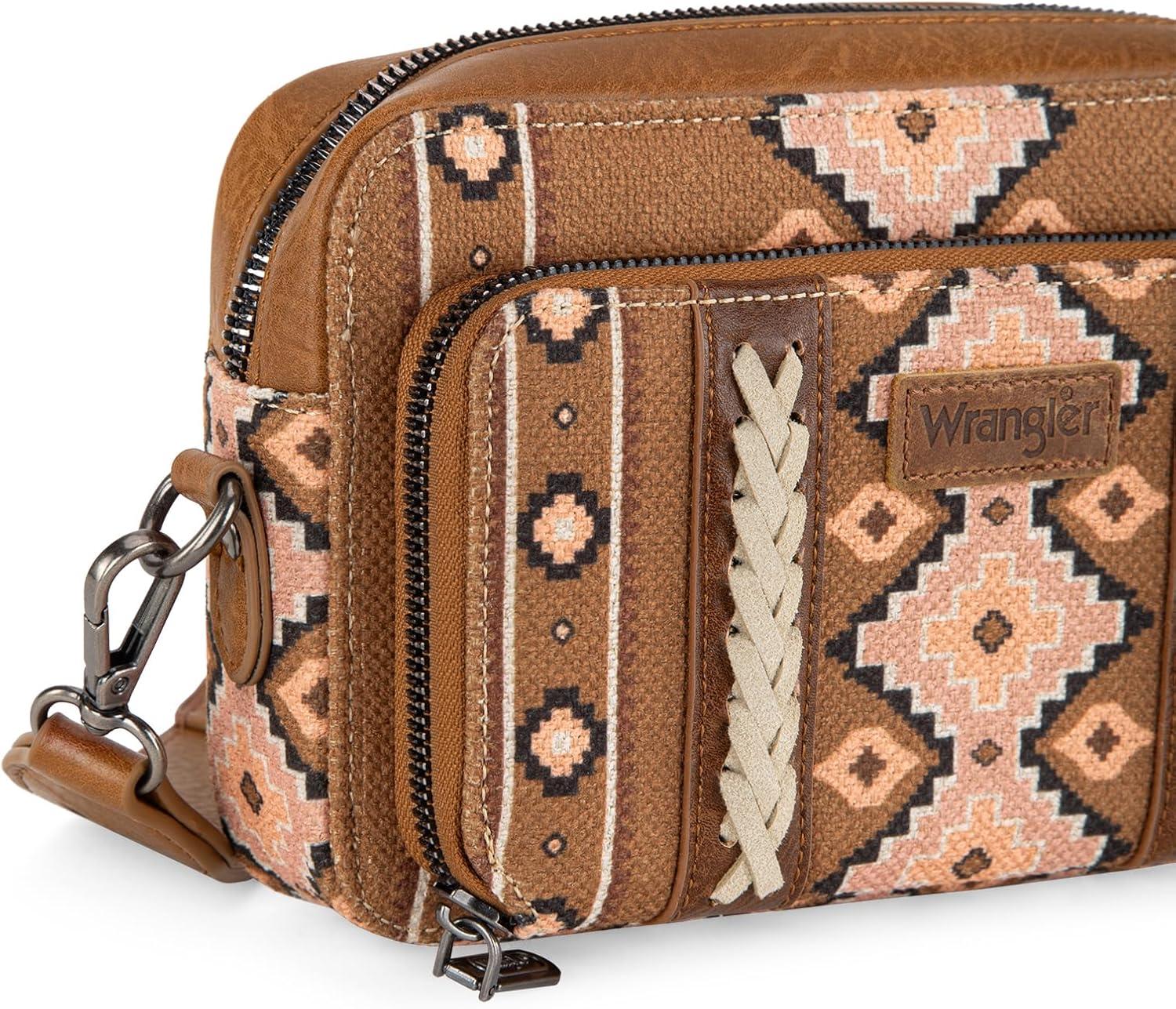 Wrangler Crossbody Bag for Women Boho Aztec Small Multi Pocket Crossover Purse(Angel Diamond Camel With Adjustable Strap)