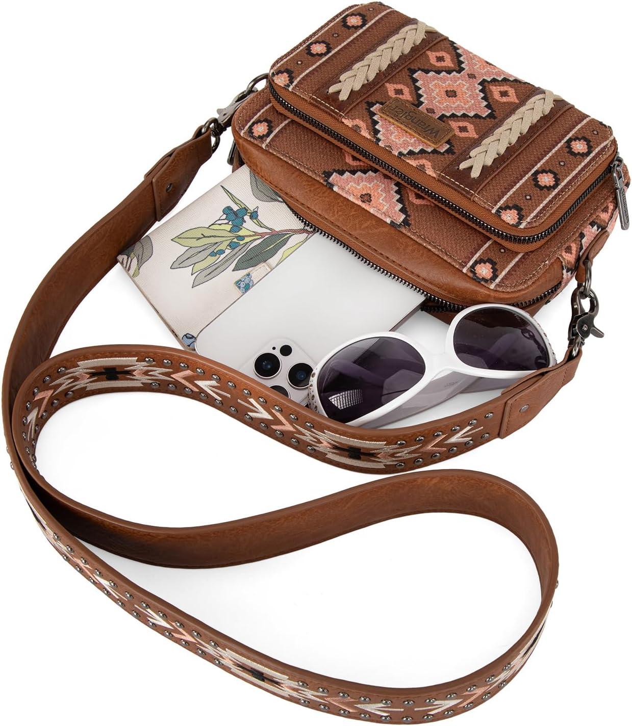 Wrangler Crossbody Bag for Women Boho Aztec Small Multi Pocket Crossover Purse(Angel Diamond Brown With Adjustable Strap)