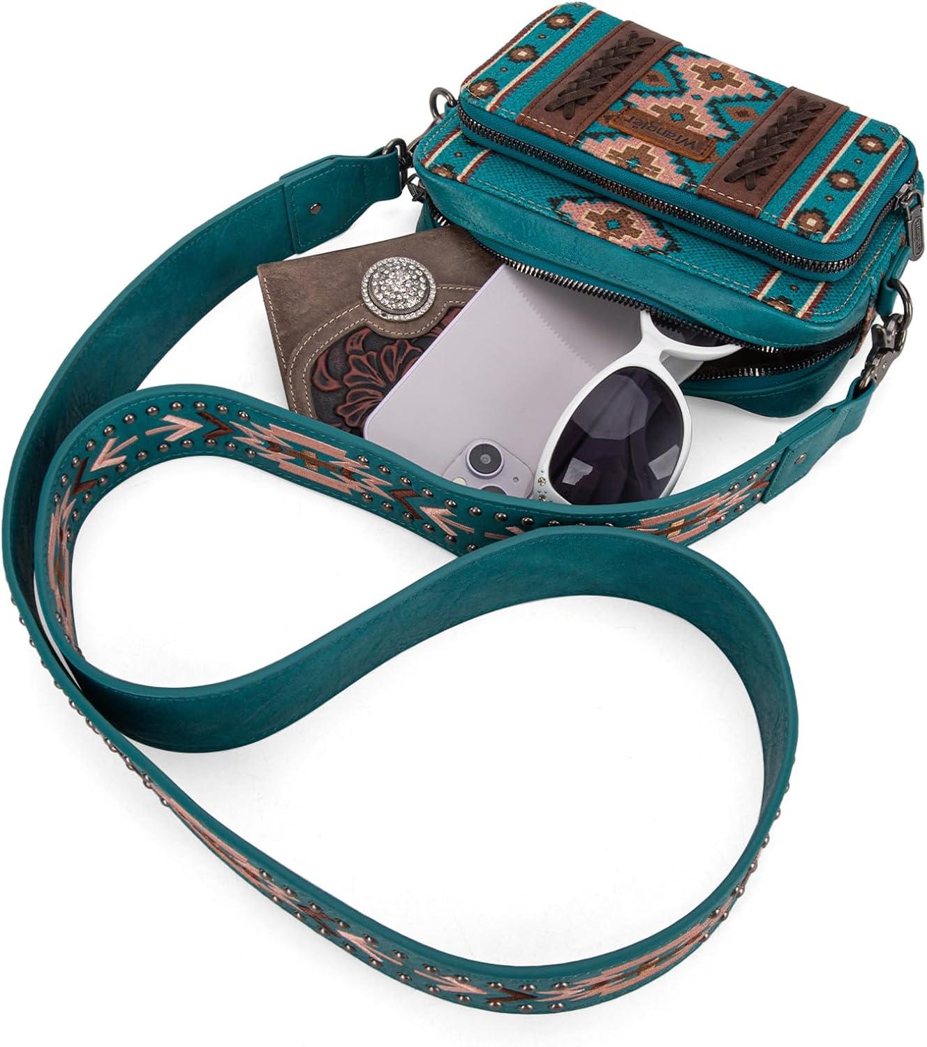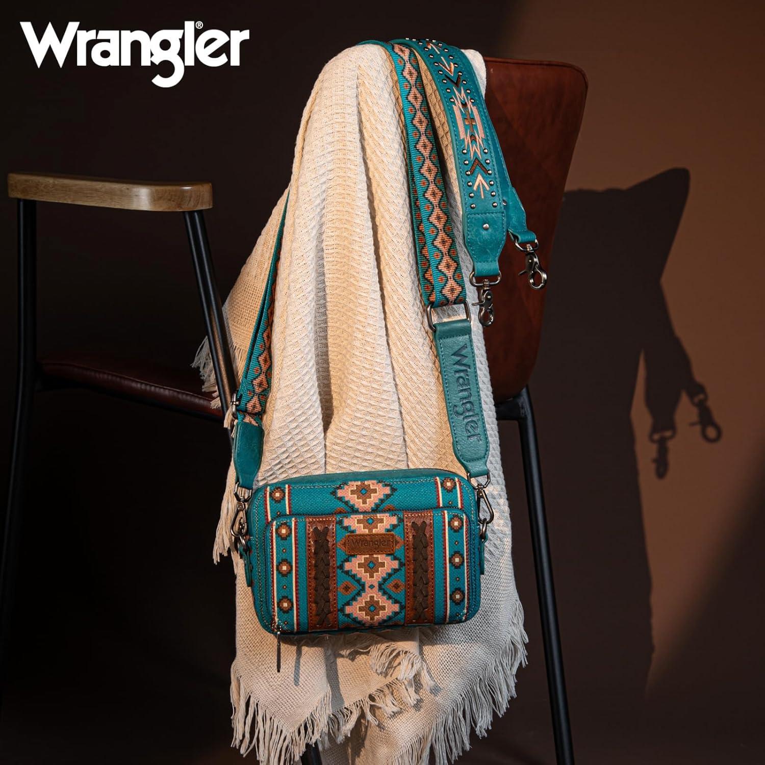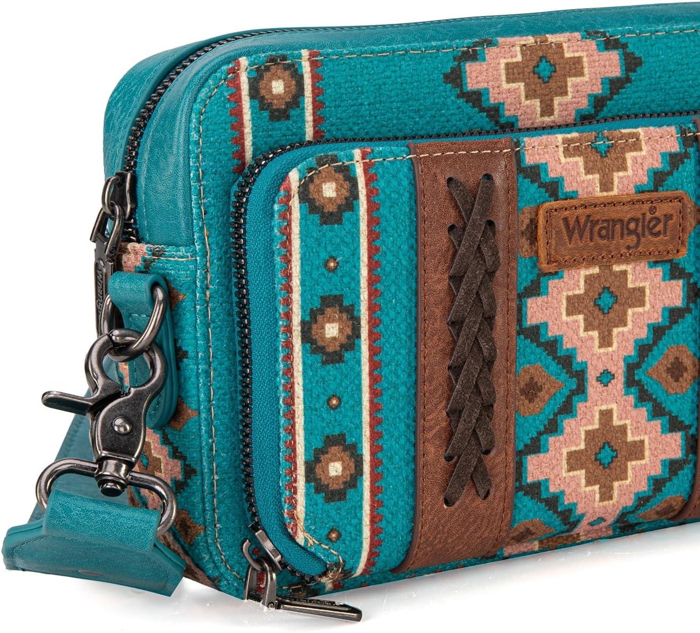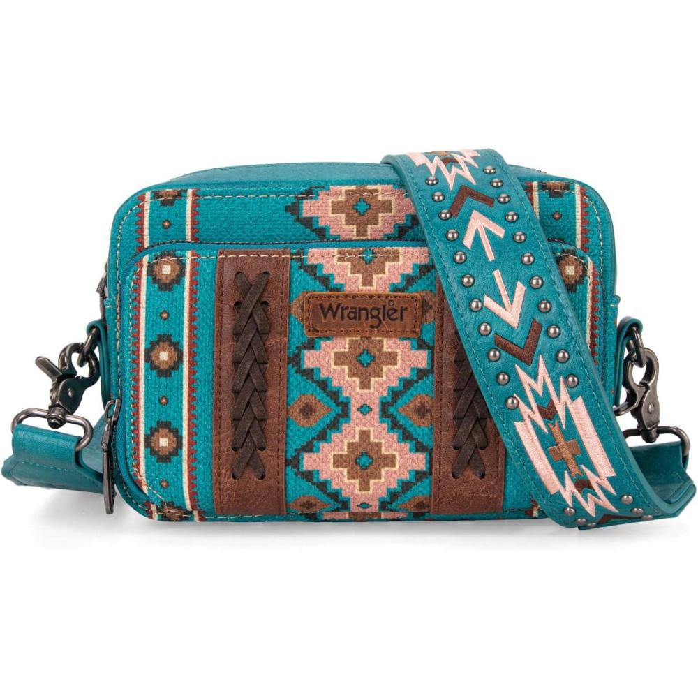 Wrangler Crossbody Bag for Women Boho Aztec Small Multi Pocket Crossover Purse(Angel Diamond Dark Turquoise With Adjustable Strap)