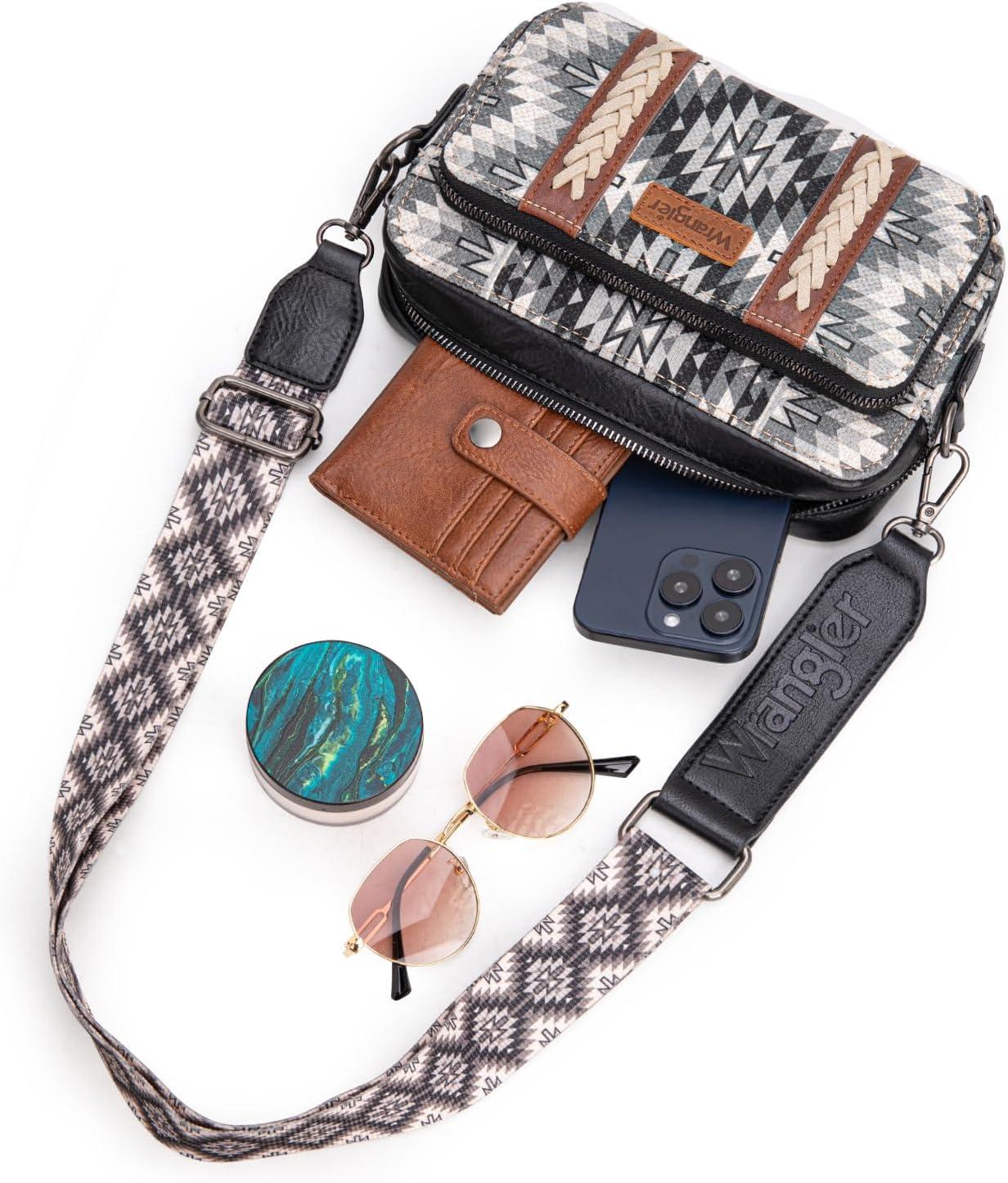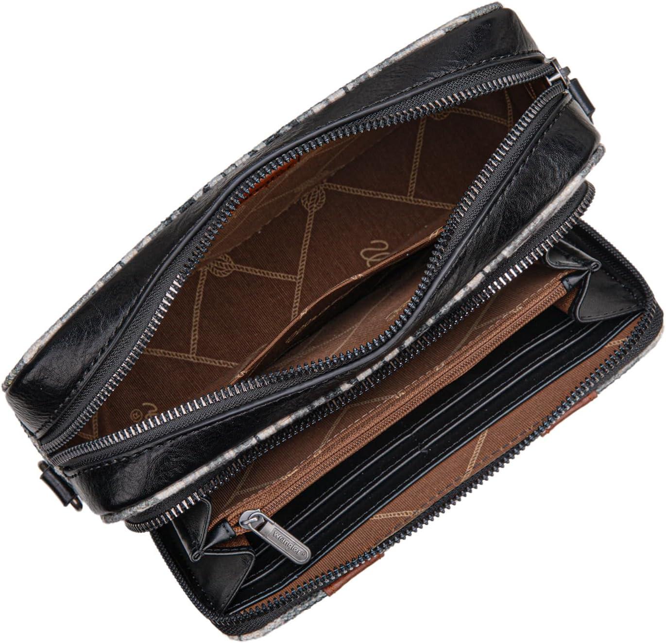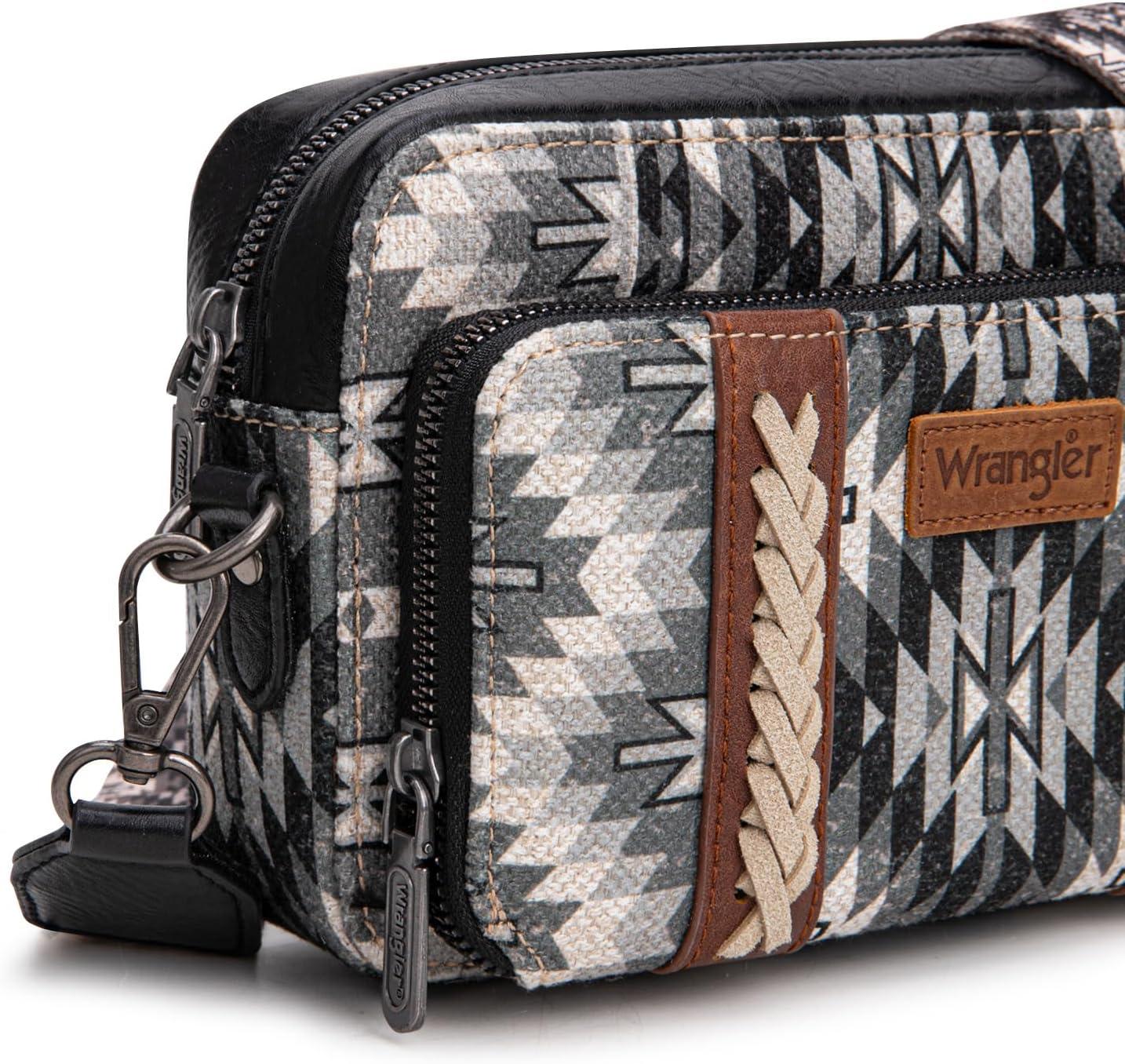 Wrangler Crossbody Bag for Women Boho Aztec Small Multi Pocket Crossover Purse(Angel Retro Black)