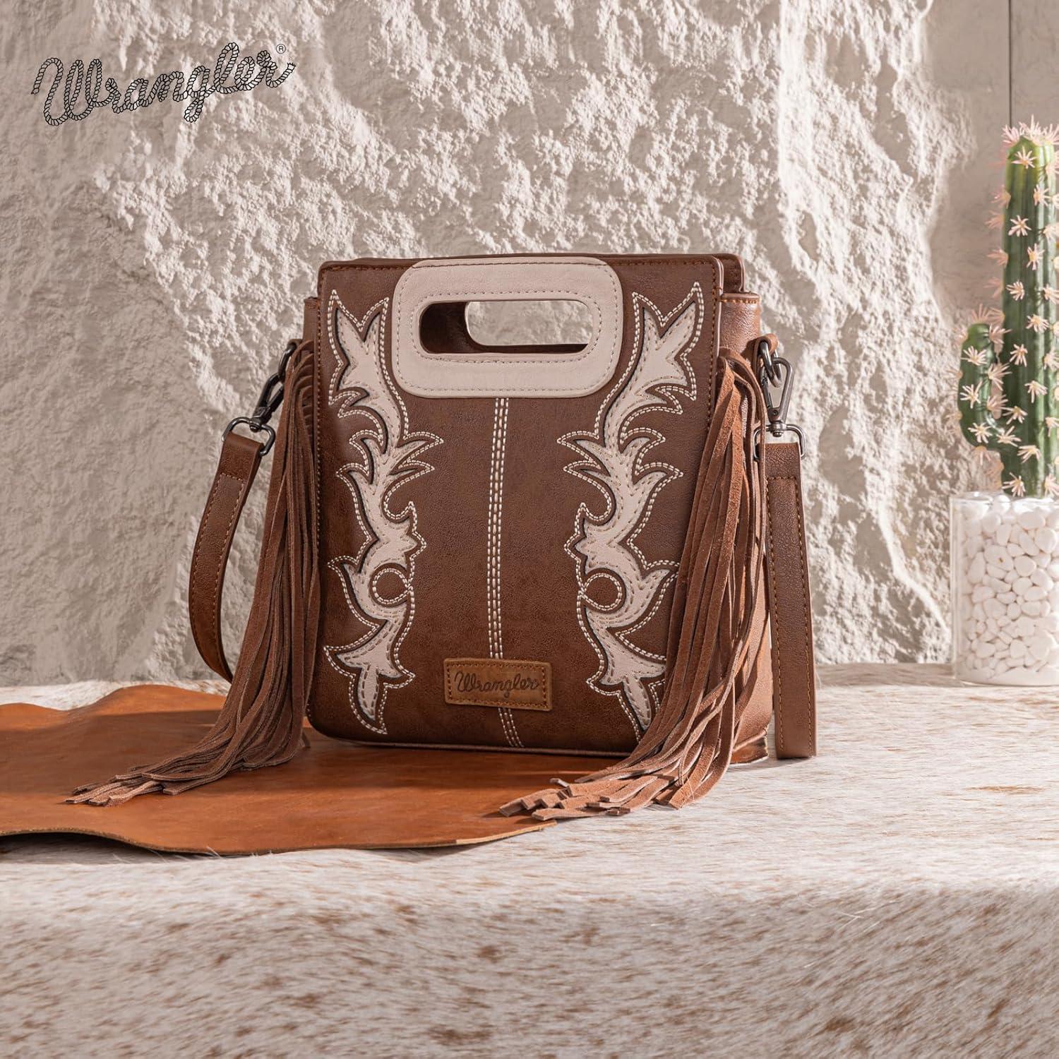 Wrangler Crossbody Bags for Women Western Fringe Top Handle Handbags Embroidered Boot Scroll Crossbody Bag(E-brown)