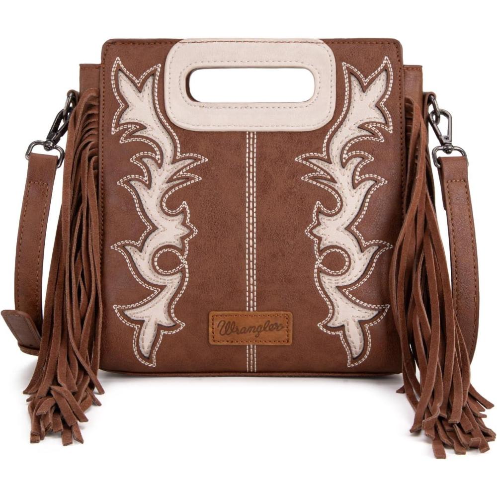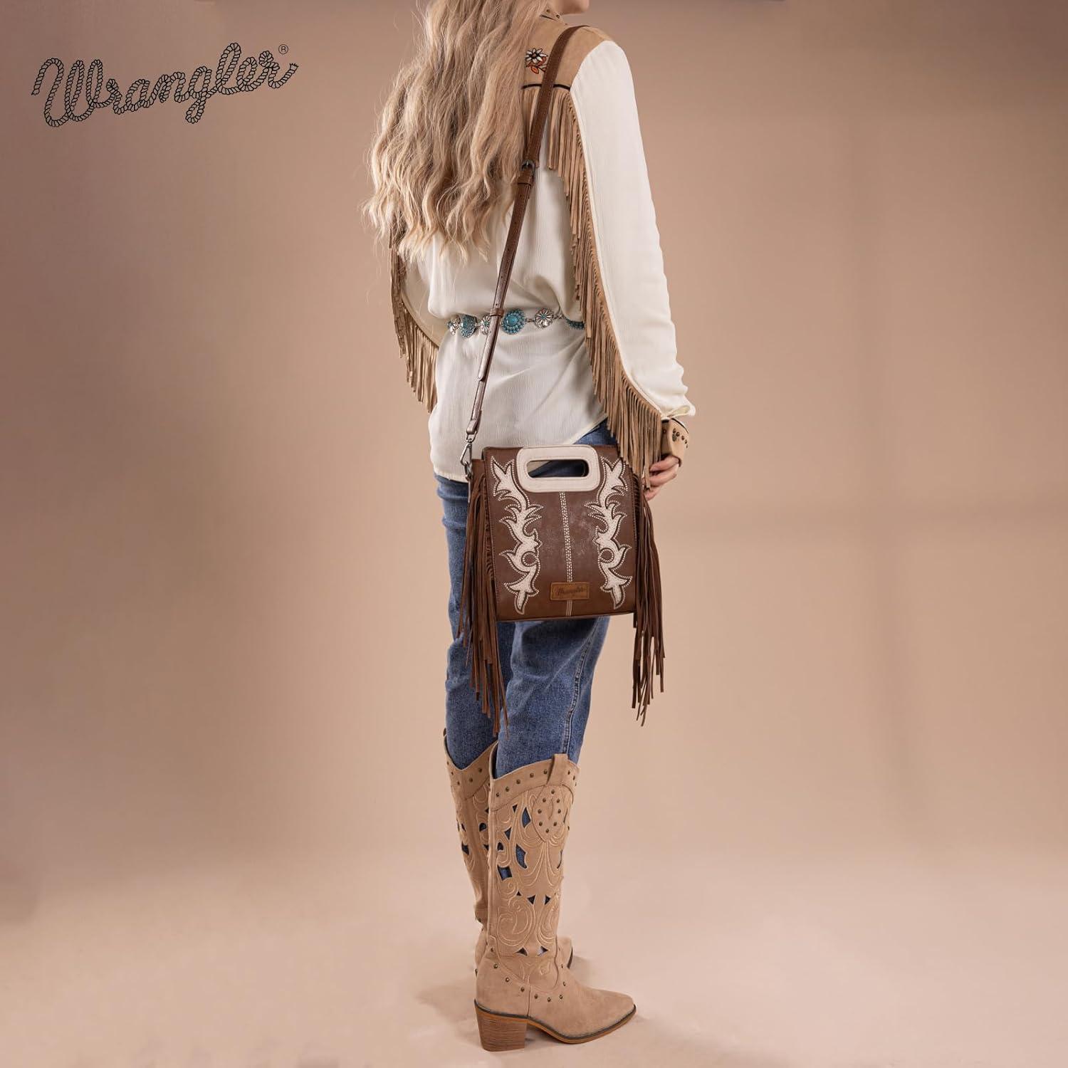 Wrangler Crossbody Bags for Women Western Fringe Top Handle Handbags Embroidered Boot Scroll Crossbody Bag(E-coffee)
