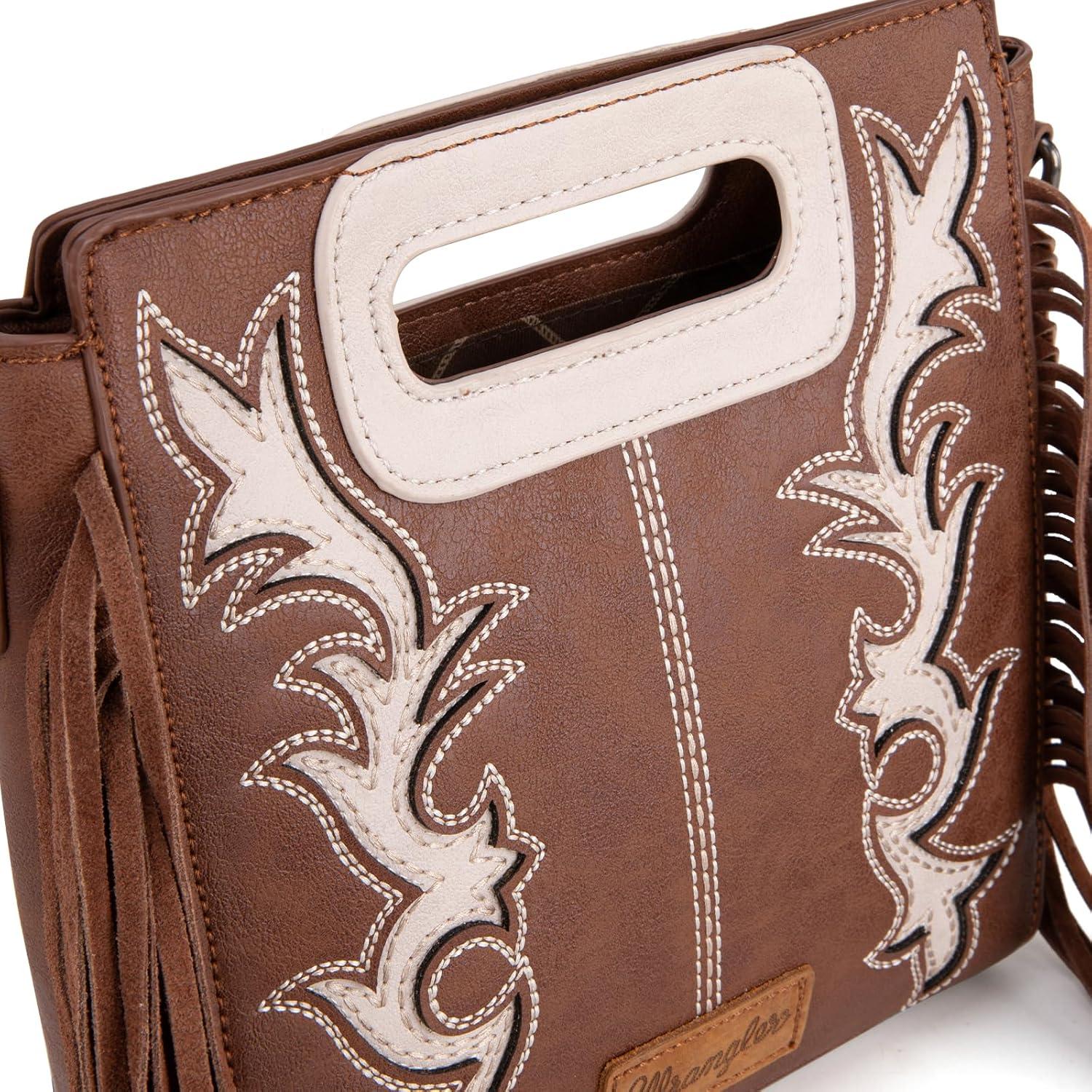 imageWrangler Crossbody Bags for Women Western Fringe Top Handle Handbags Embroidered Boot Scroll Crossbody BagEbrown