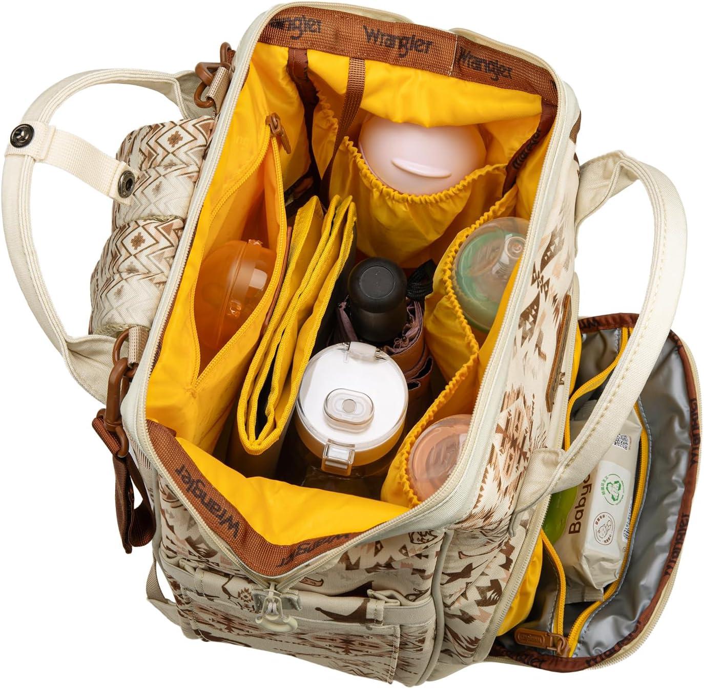 Southwest Pattern: Embrace the vibrant and gorgeous western pattern of the Wrangler diaper bag. The rugged yet chic Wrangler aesthetic adds a trendy touch, making parenting more convenient and stylish