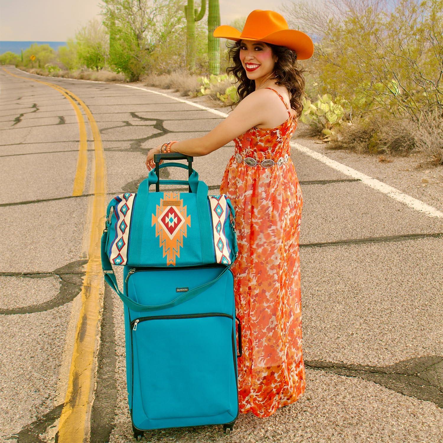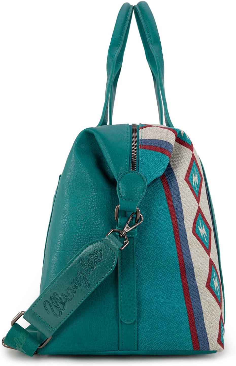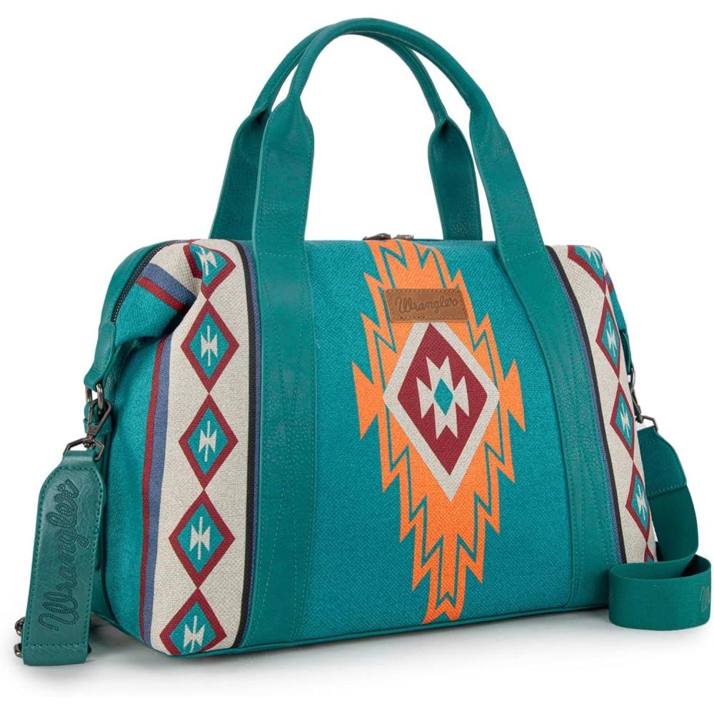 Wrangler womens duffle bag features an Aztec tapestry design that adds a western flair and captures a wild and free spirit.