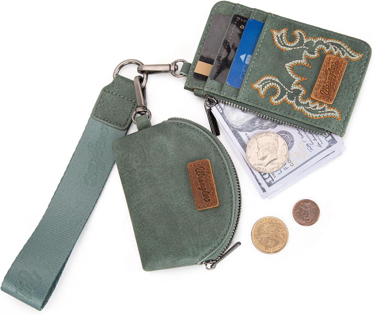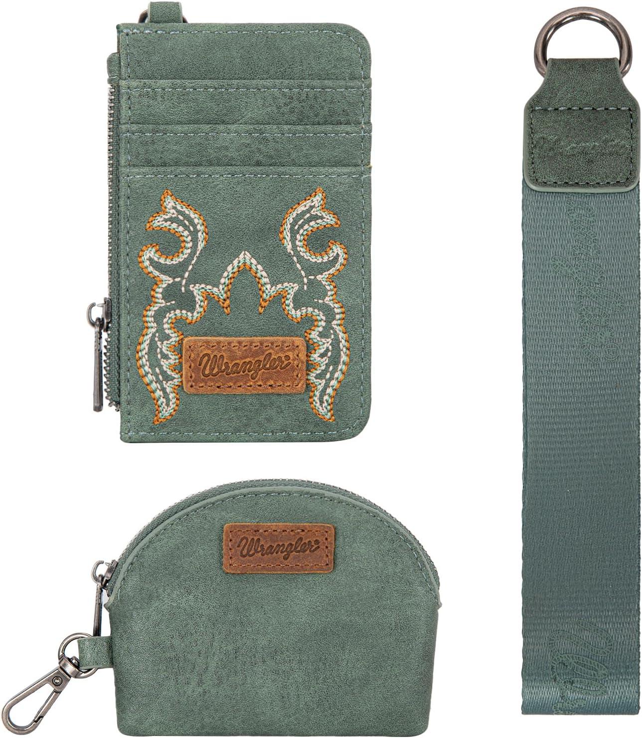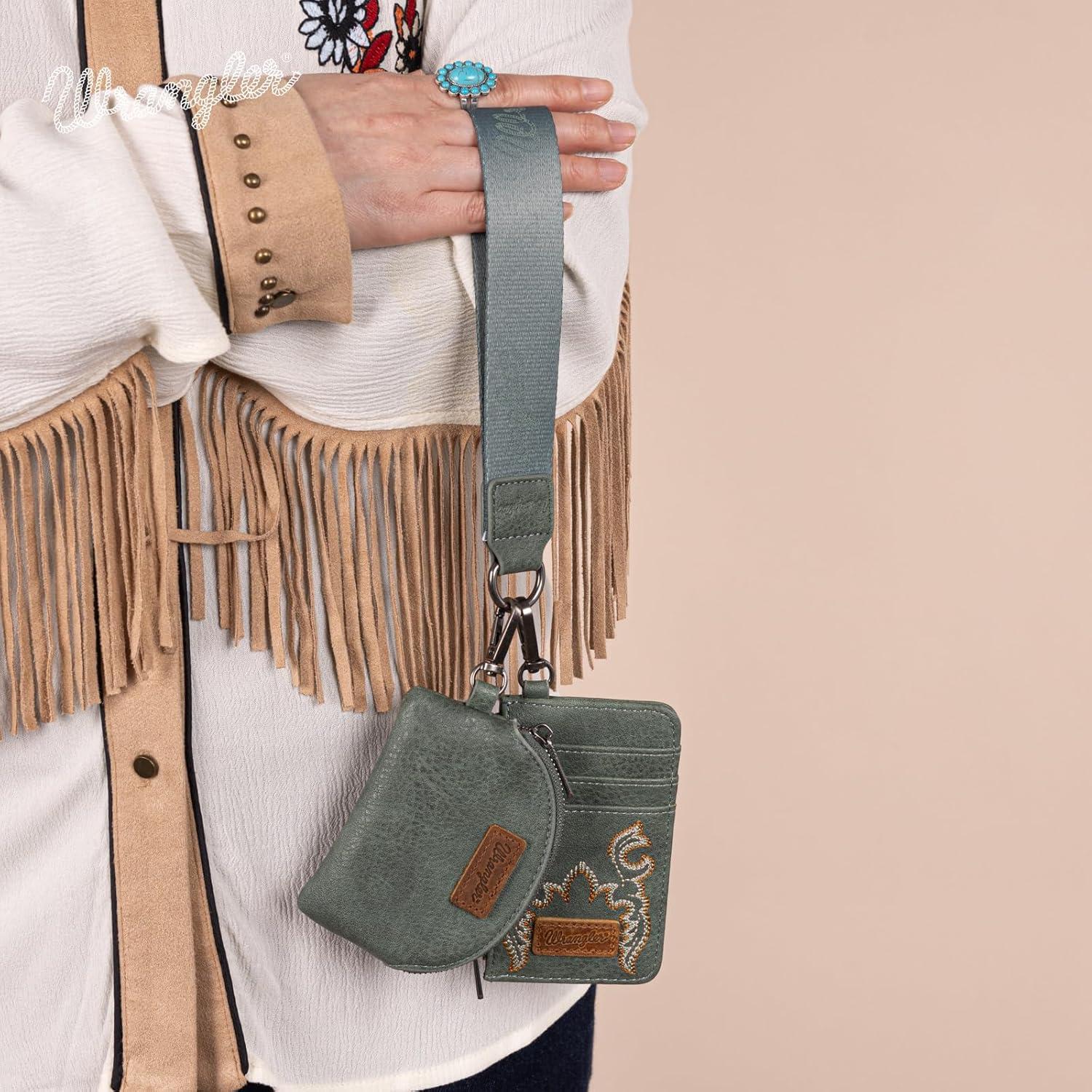 Wrangler KeyChain Wristlet Wallets for Women Western Dual Pouch Wristlet Embroidered Boot Scroll Card Holder Wallet With Zipper(Green)