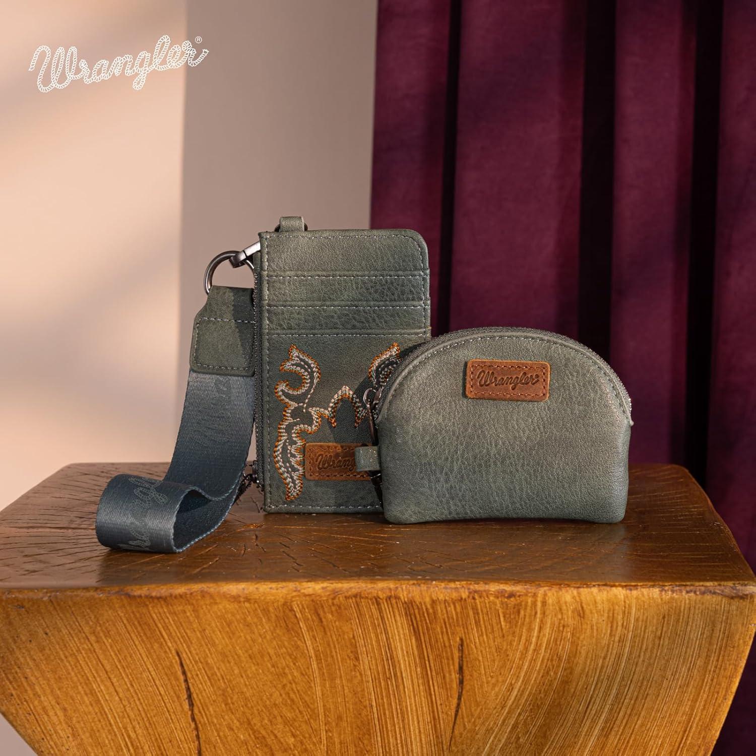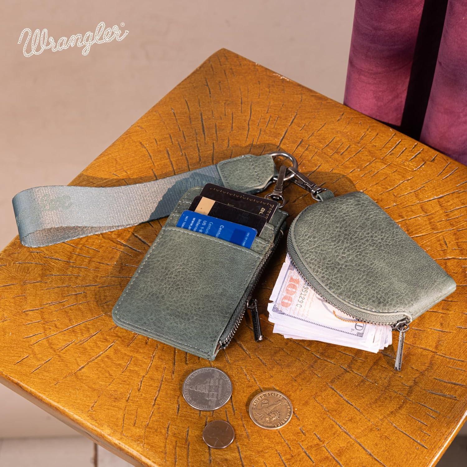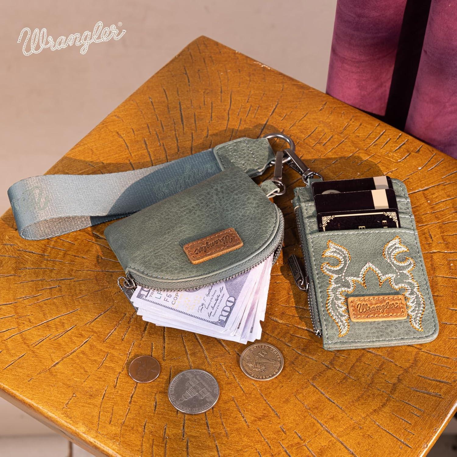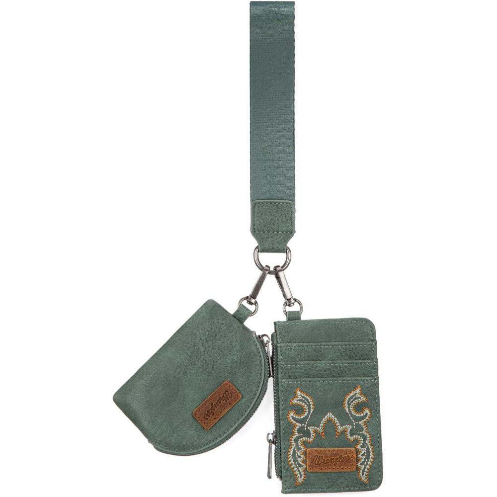 Wrangler KeyChain Wristlet Wallets for Women Western Dual Pouch Wristlet Embroidered Boot Scroll Card Holder Wallet With Zipper(Green)