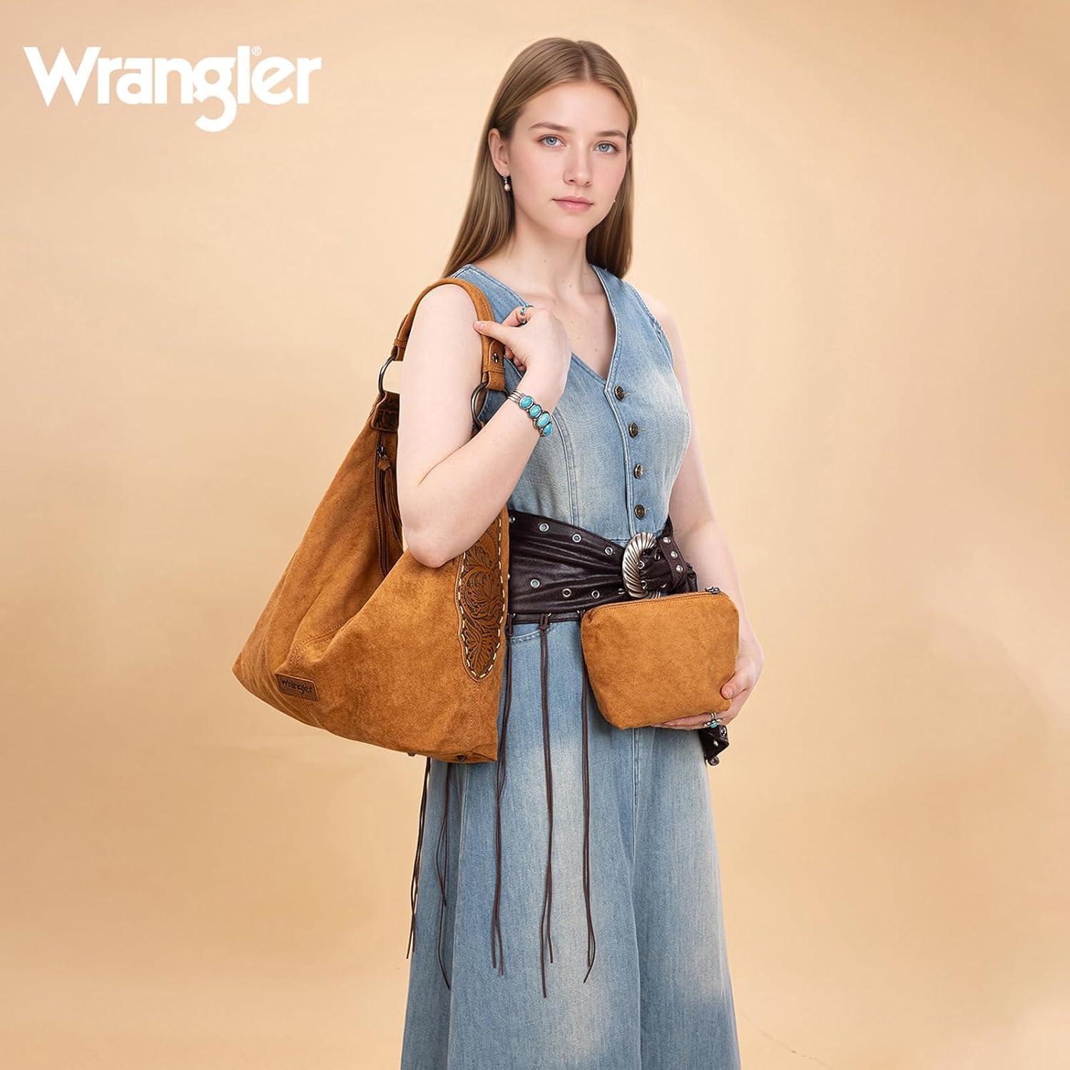 Wrangler Suede Hobo Purse for Women Embossed Soft Slouchy Shoulder Bag 2Pcs Set(Drop-coffee)
