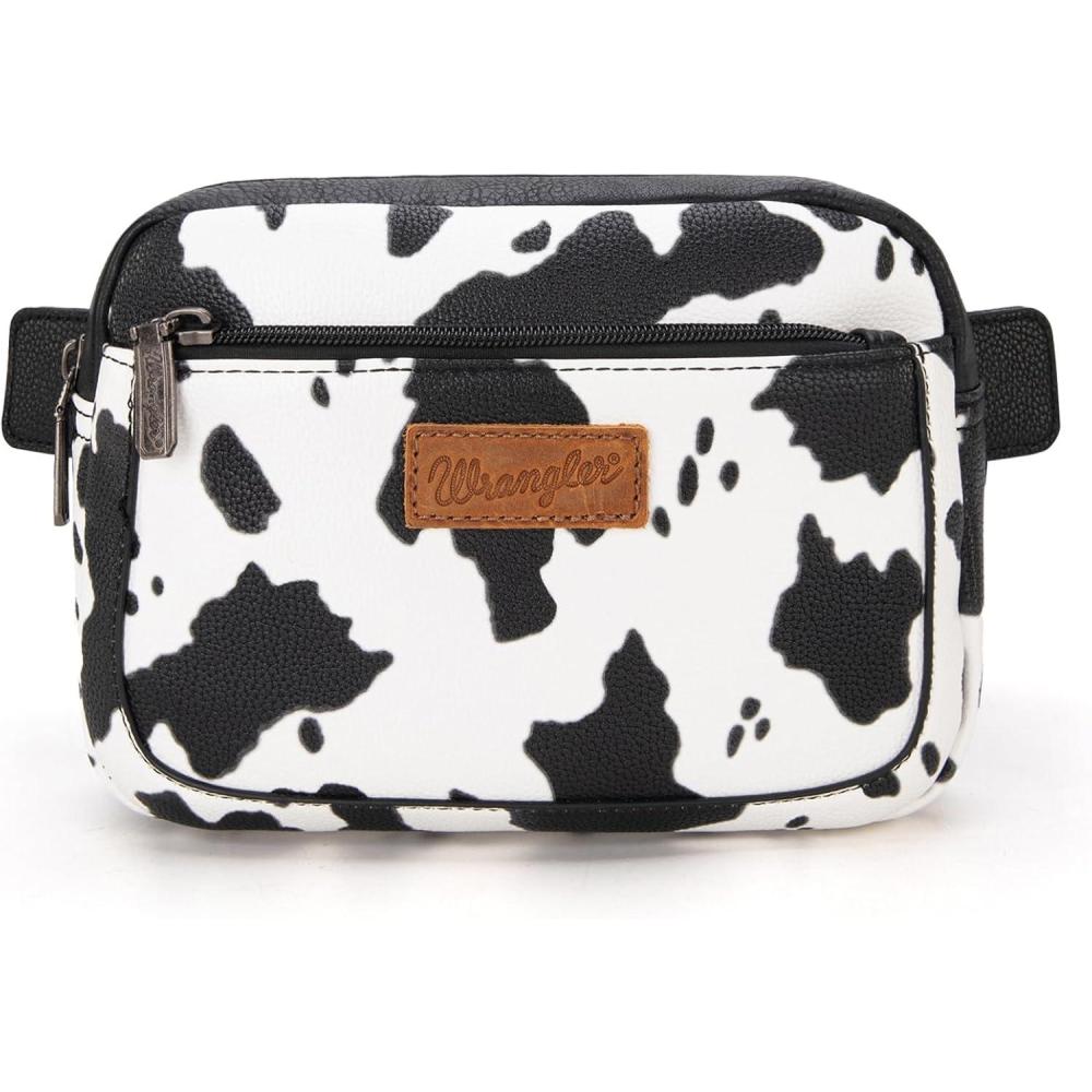 Featuring a cow print design and durable construction, the Wrangler crossbody bag is perfect for travel, festivals, or everyday use.
