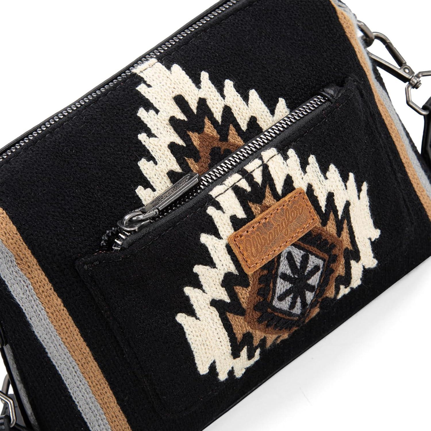 Wrangler Western Aztec Small Crossbody Bags for Women Multi Pocket Over Shoulder Crossbody Purse with Guitar Strap(Black)